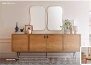 • • • • Modern style • • • • Lighter shades of wood • • • • 3 different size options for sideboards • • • • Metal legs in in matte copper color • • • • Storage opportunity in in narrow spaces with with high console with with shelves • • • Standard Drawer • • • White stitched and and and aged bronze coated handle design on on on on brown leather • • • • • Amorphous shaped mirror • • • • • Oval extendable extendable table table table • • • • • Round non-extendable table table table with with wooden wooden turned legs legs • • • • Pattern application on on on round table table table top surface • • • • Chairs with with wooden wooden legs legs E1 Standards in Material