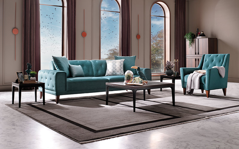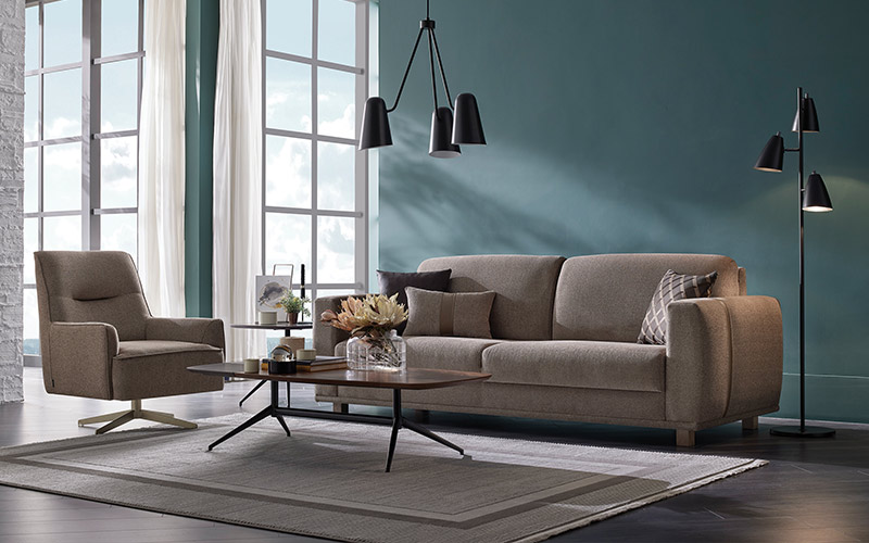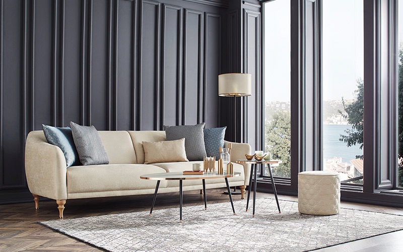 Evinizin duvarlarında gri, antrasit ve füme gibi tonları kullandıysanız, eşyalarınızda da benzer tonlardan faydalanabilirsiniz. Örneğin koyu gri bir duvar rengine sahipseniz daha açık gri tonlarında koltuk takımları kullanabilirsiniz. Tabii ki yalnızca gri tonlarını seçmek zorunda değilsiniz. Dilerseniz krem ve beyaz tonlarda koltuklar da tercih edebilirsiniz. Halı, sehpa gibi aksesuarlarınızı da duvarlarınızla uyumlu renklerden seçerek oda genelinde bütünsel bir görünüm oluşturabilirsiniz.