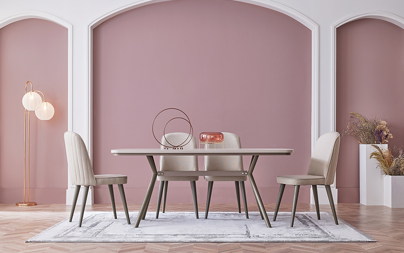 Ahşap, rattan, keten gibi doğal malzemeler pastel tonlarla kullanılan aksesuarlar için mükemmel seçimlerdir. Ancak daha dikkat çekici ve iç mekanda odak noktası belirlemek için altın, kadife ve seramik gibi ışıltılı ürünler de mevcuttur. Bu küçük detaylarla ortama biraz ışıltı ekleyebilirsiniz. Örneğin ayaklarında ya da kulplarında altın detaylar bulunan yemek odası takımları pastel renkli duvar kağıtları ve halılarınızla kusursuz görünür. Hem takımda yer alan konsol, ayna, yemek masası ve sandalyelerinizi vurgular hem de mekanda rahatlatıcı bir etki yaratır. Burada dikkat etmeniz gereken ise pastel tonlarda ev dekorasyonu yaparken ön plana çıkarmak istediğiniz mobilyalarınızı stilinize uygun seçmenizdir. Çünkü soft renkler arasında öne çıkan altın detaylı pastel renk koltuk takımları, berjer ya da yemek takımları tüm odanın stilini belirler.
