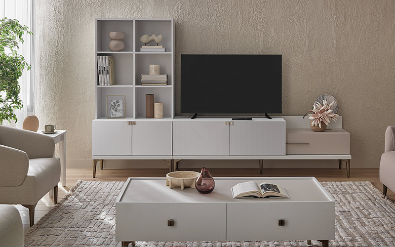 TV ünitesinin rafları, salonun karakterini belirleyen küçük detaylar için ideal alanlardır. Kitaplar, heykeller, çerçeveler ya da bitkilerle kişiselleştirilen bu bölümler, hem estetik görünür hem de yaşam alanına sıcaklık katar. Dengeli yerleştirilen objeler, görsel karmaşayı önler ve ferah bir etki yaratır. Renkleri ve boyutları birbirini tamamlayan parçalar, salonu olduğundan daha bütünlüklü ve düzenli gösterir.