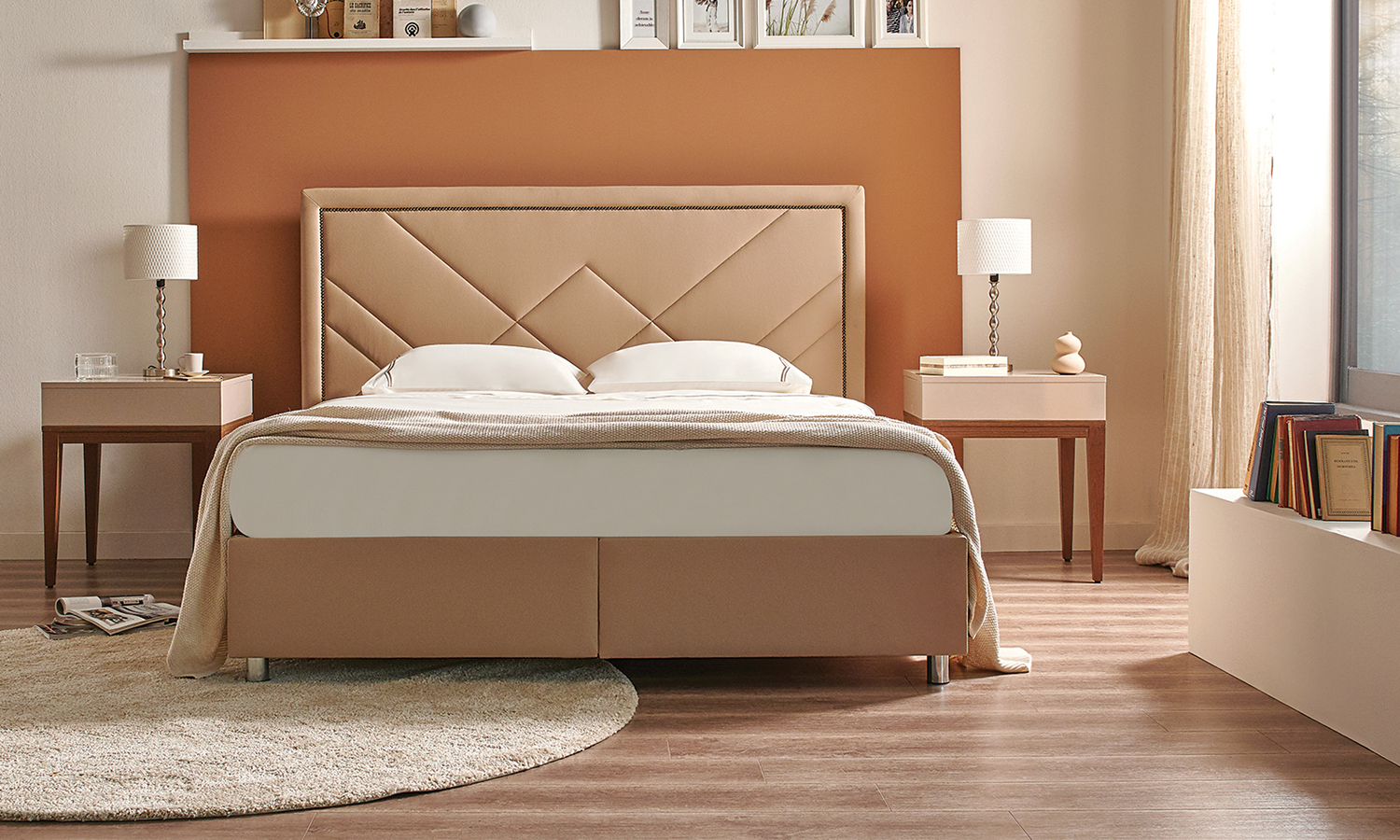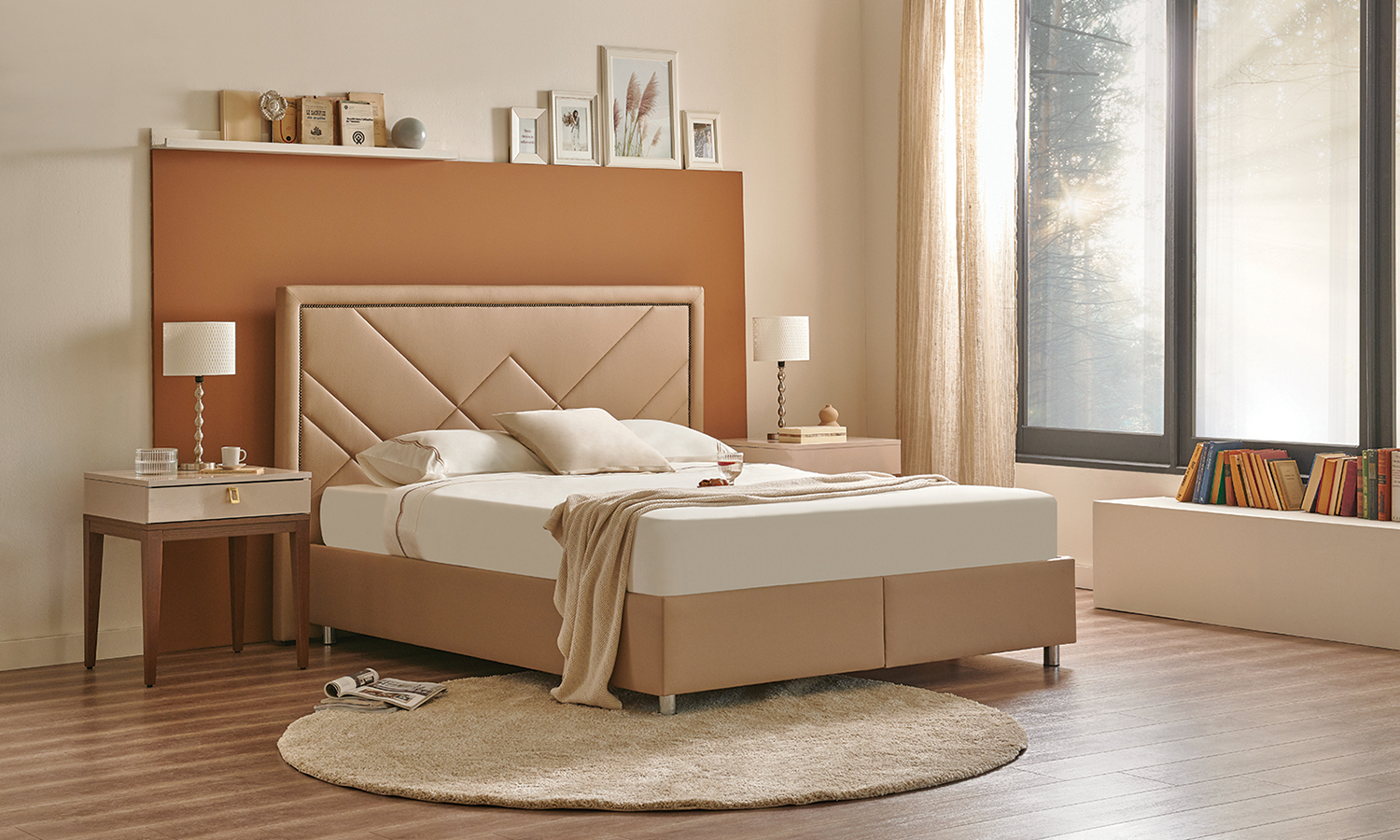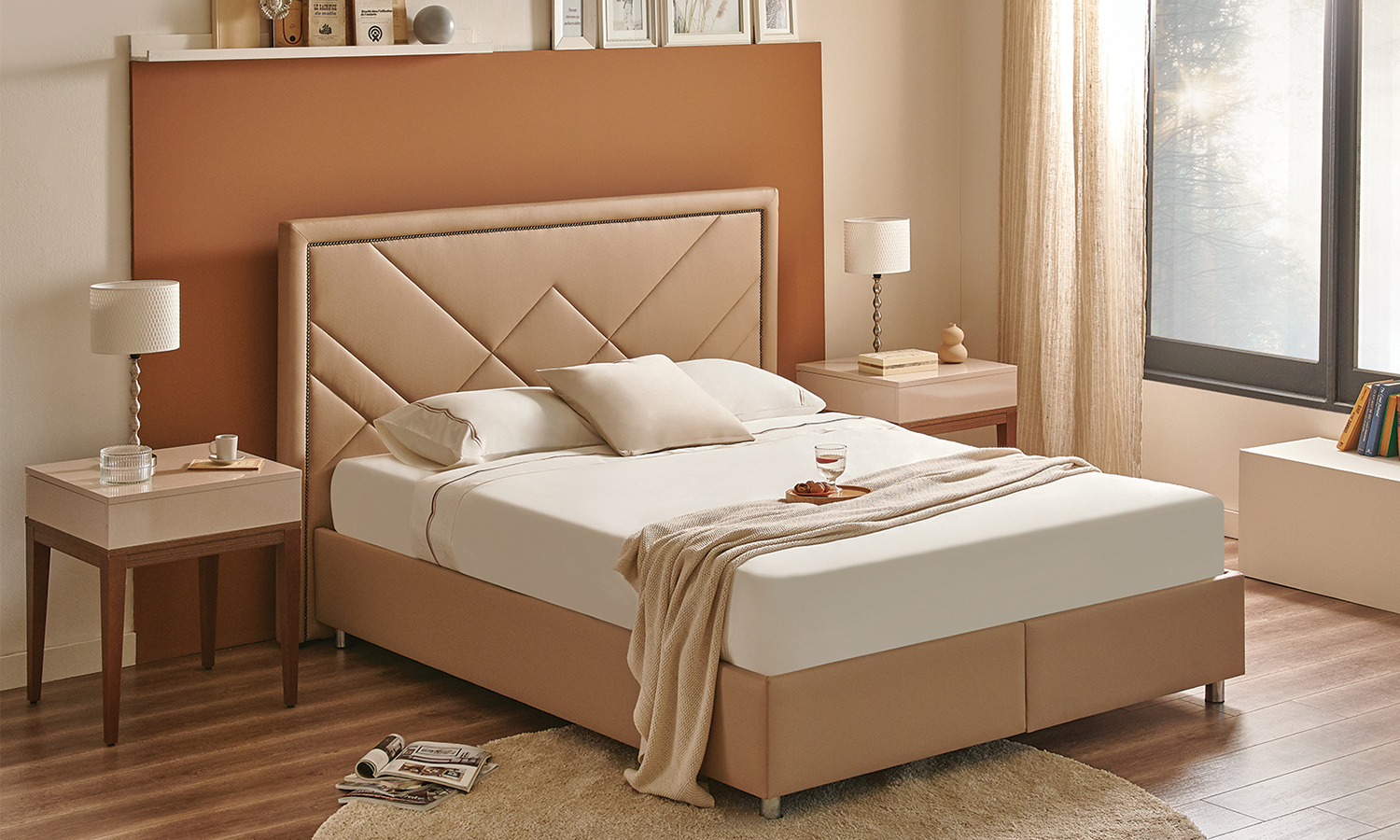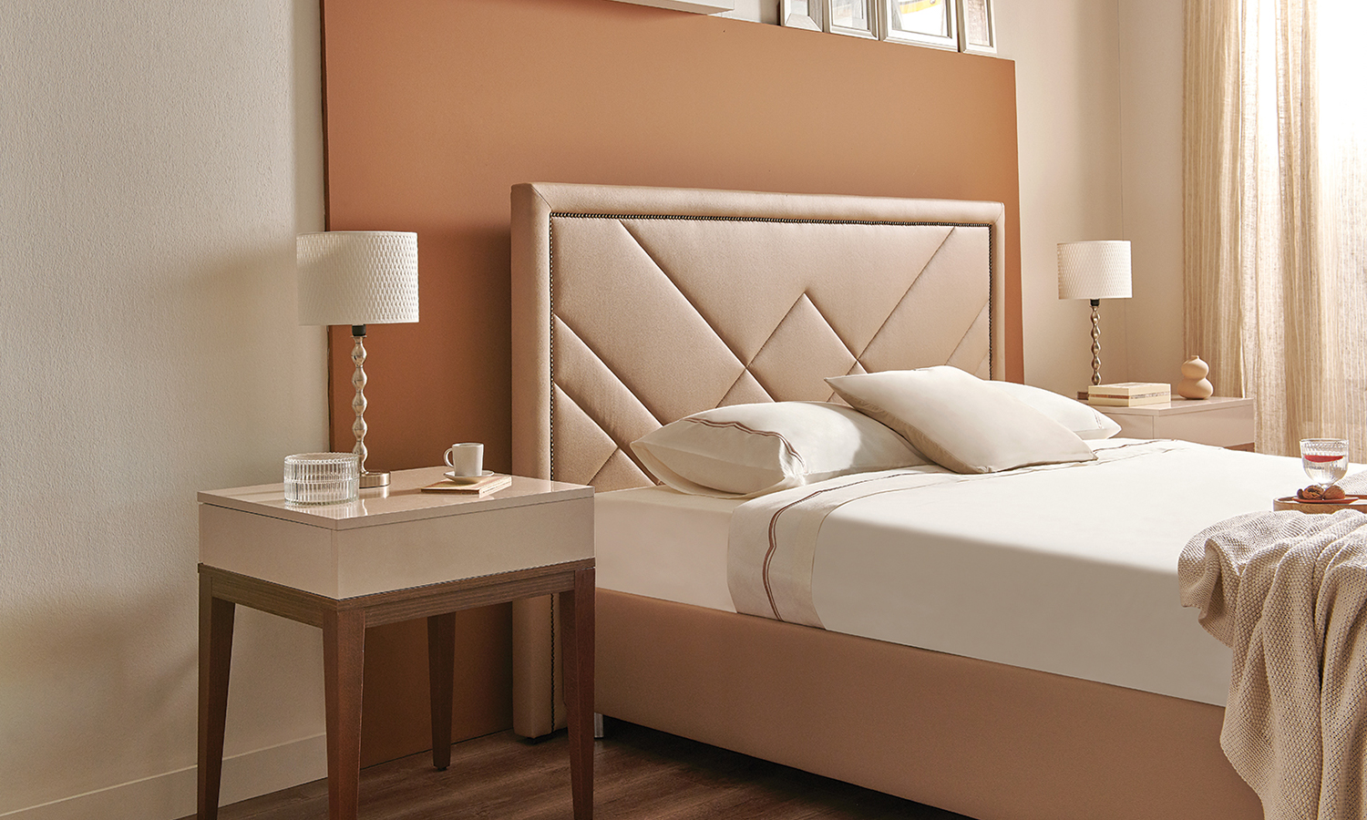 Pera Base signs contemporary bedrooms with its simple and stylish design. While it provides extra storage areas with its large internal volume, it fits perfectly to many different headboard models with its rich colour and fabric alternatives.