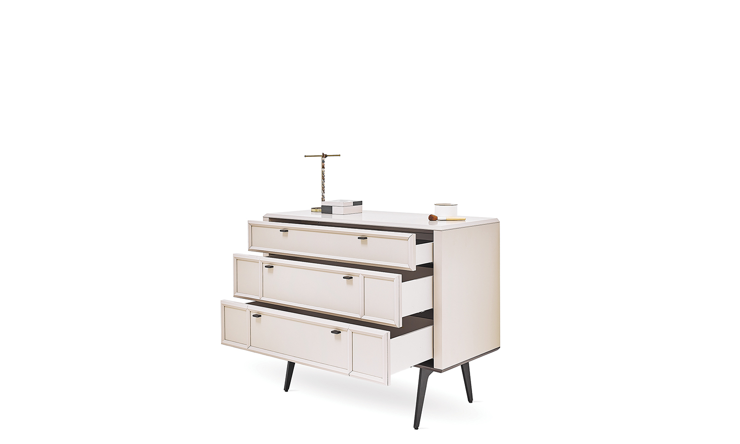 • Black metal handle and leg design on the chest of drawers in harmony with the series