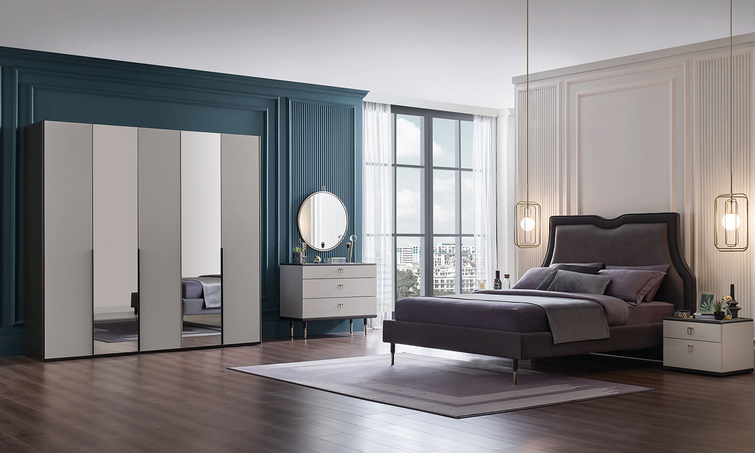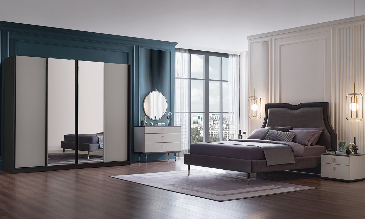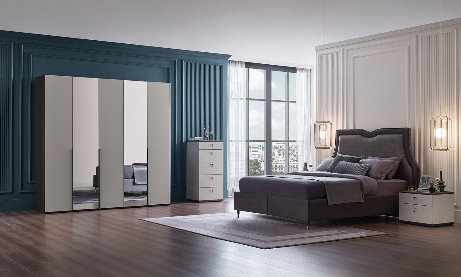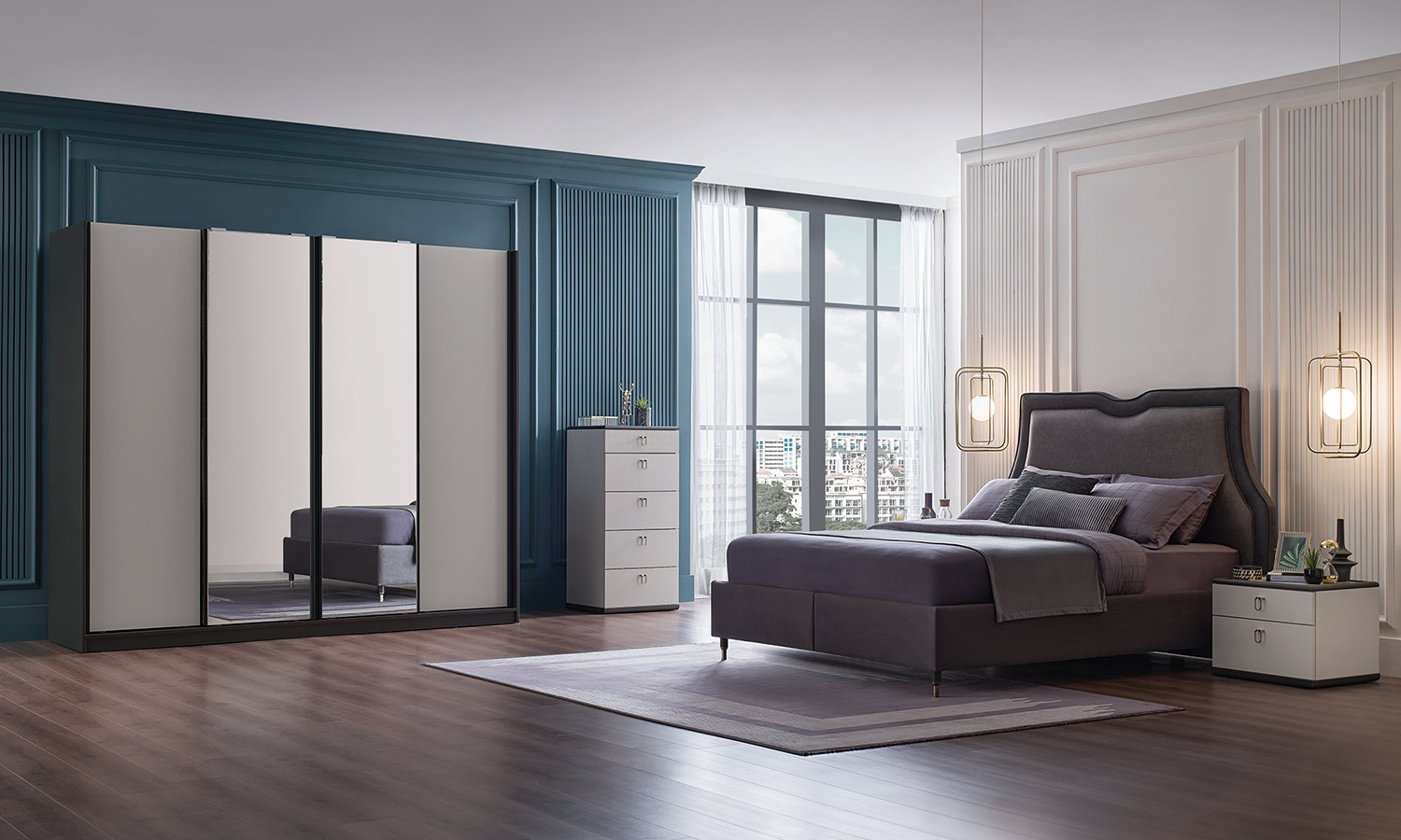 Standing out with its modern elegance, the Eterna Bedroom will be the favorite piece of those who love ostentatious decoration items. Achieving the harmony of gray and black colors, the Eterna Bedroom offers an elegant and stylish effect. It responds to different use needs with wardrobe alternatives with 5 doors, 6 doors, or sliding doors.