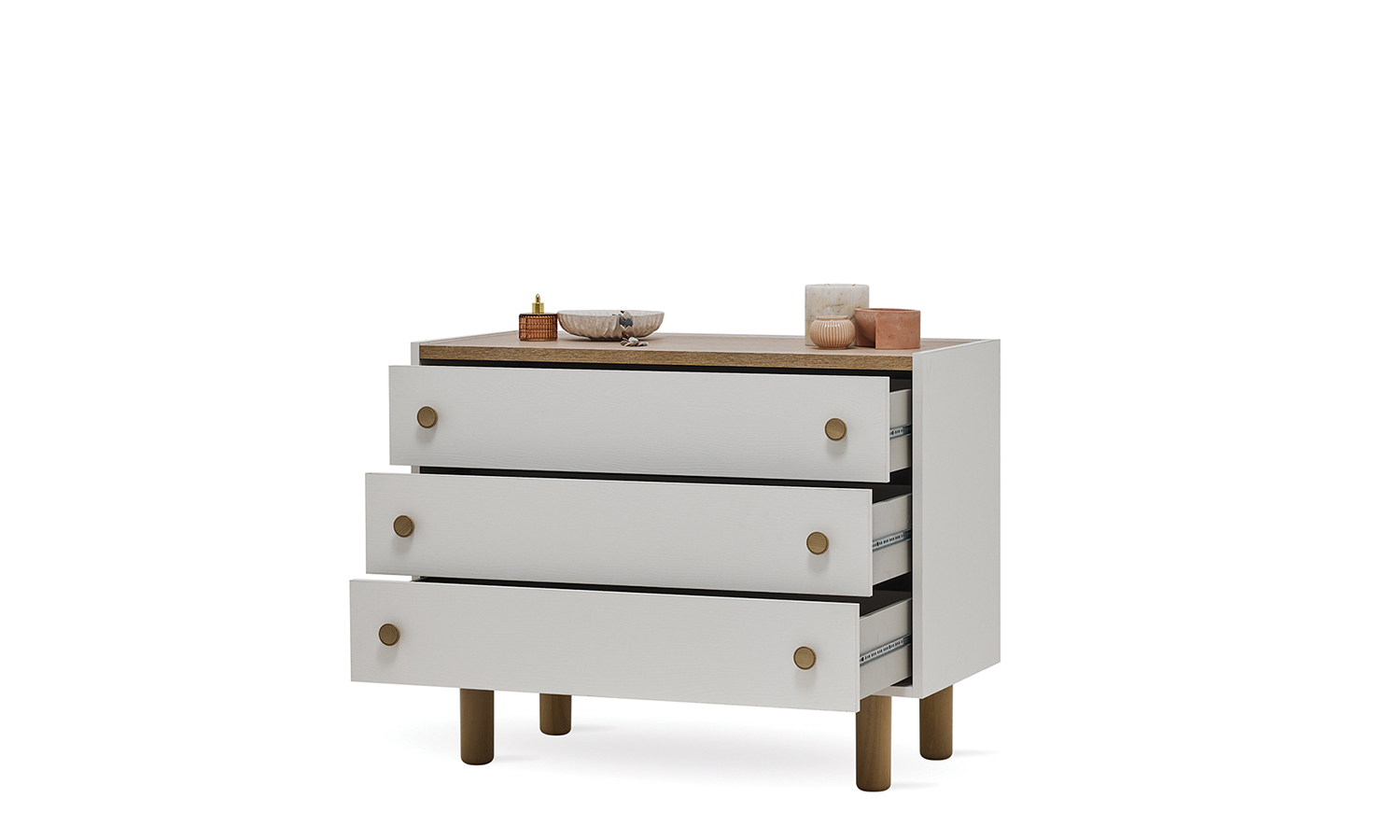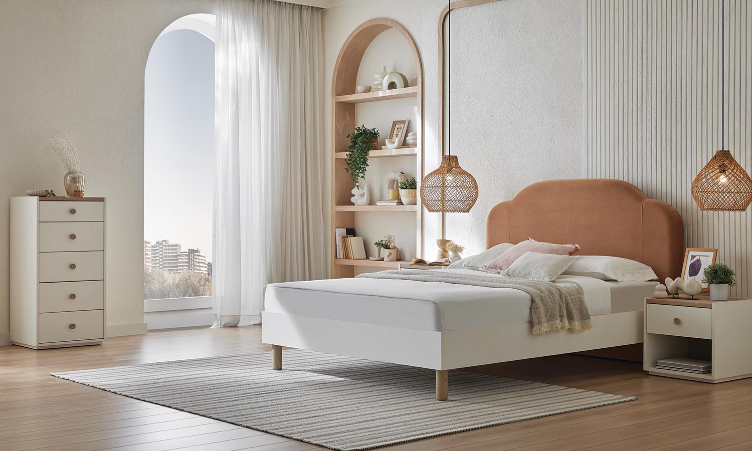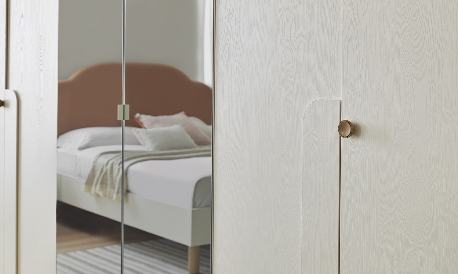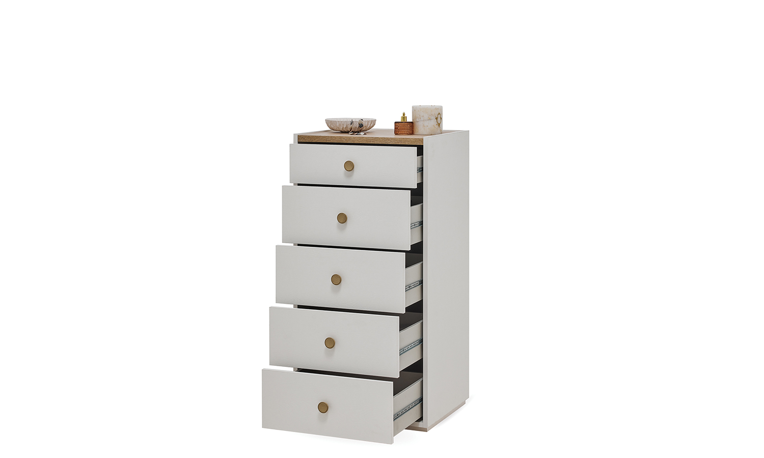 Reflecting the peaceful unity of beige and oak tones, the oval lines and arched forms of the Kozy Bedroom provide an aesthetic integrity. A variety of chest of drawers options meet every demand, and the accessory shelf behind the full-length mirror adds even more storage space. Your bedroom will be more organized and beautiful with the high chest of drawers which adds a bohemian style on the modern storage idea.