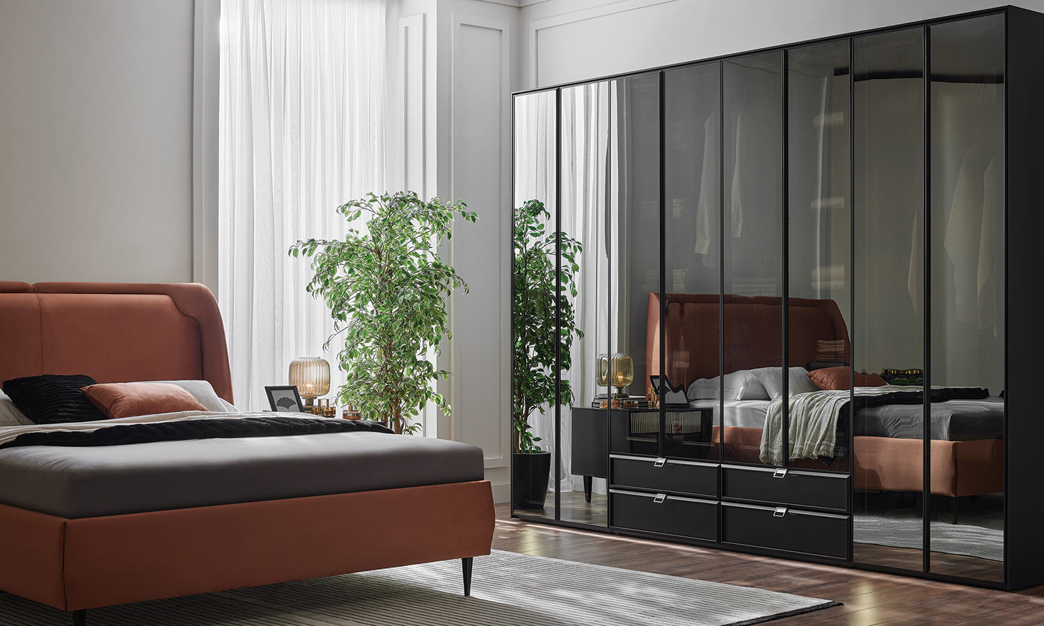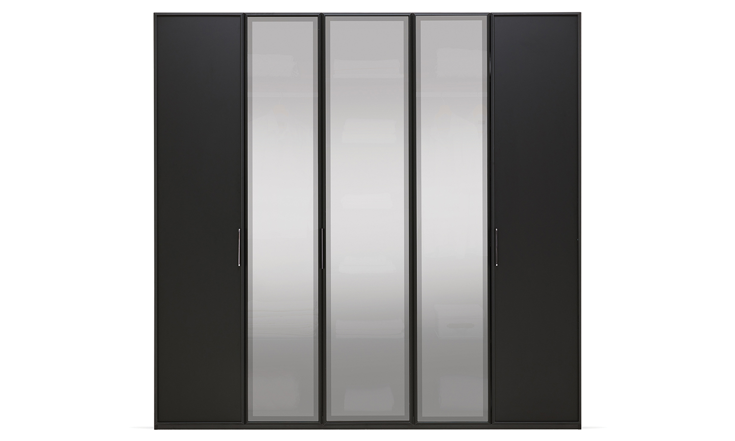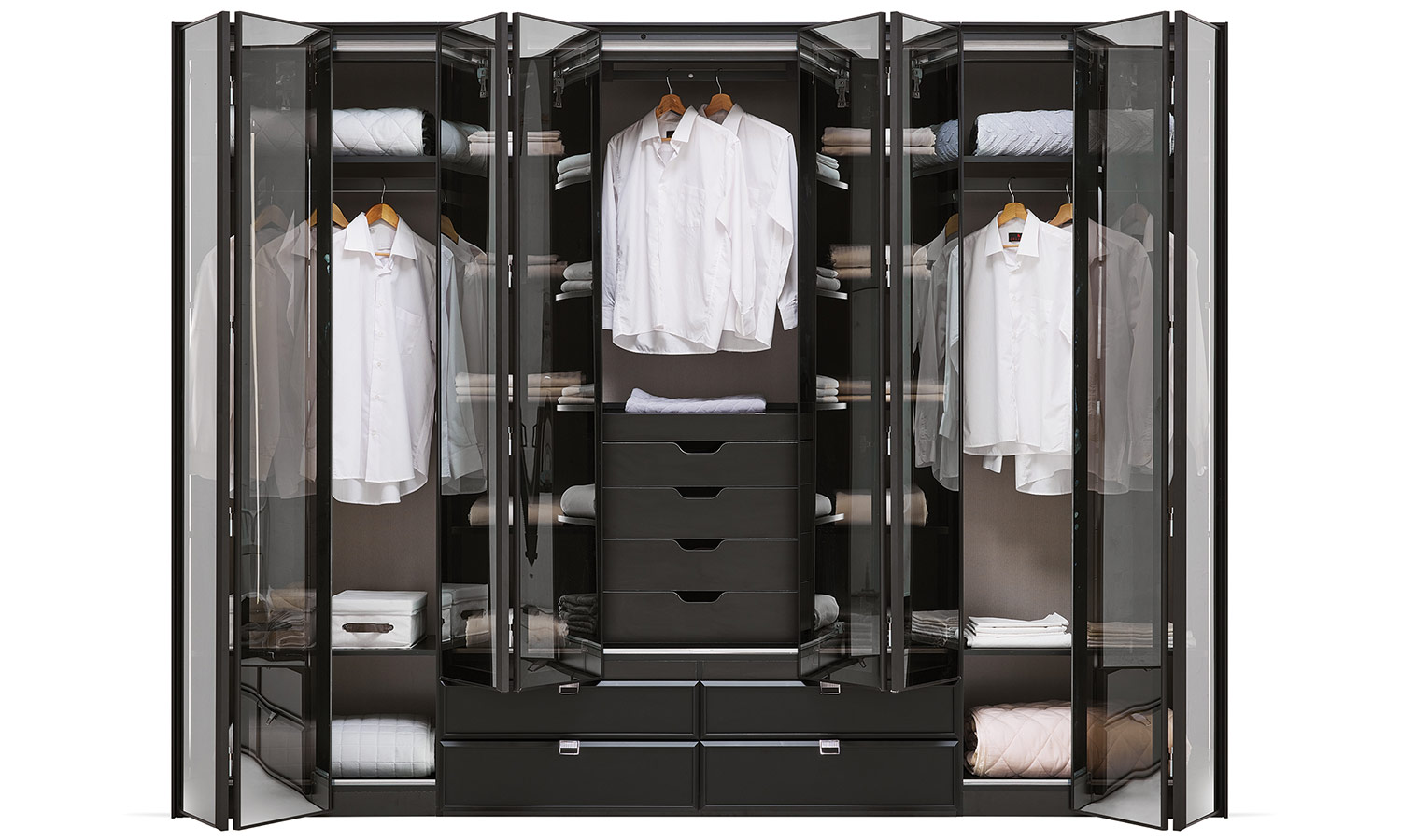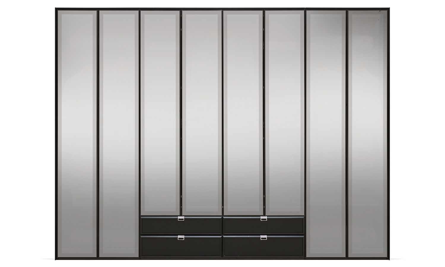 8-door wardrobe with folding doors, 3-door, 2-door and corner door wardrobes; aluminum frame cover, fumed reflected glass and tall profile applications, natural mirror use on doors of 5-door wardrobe