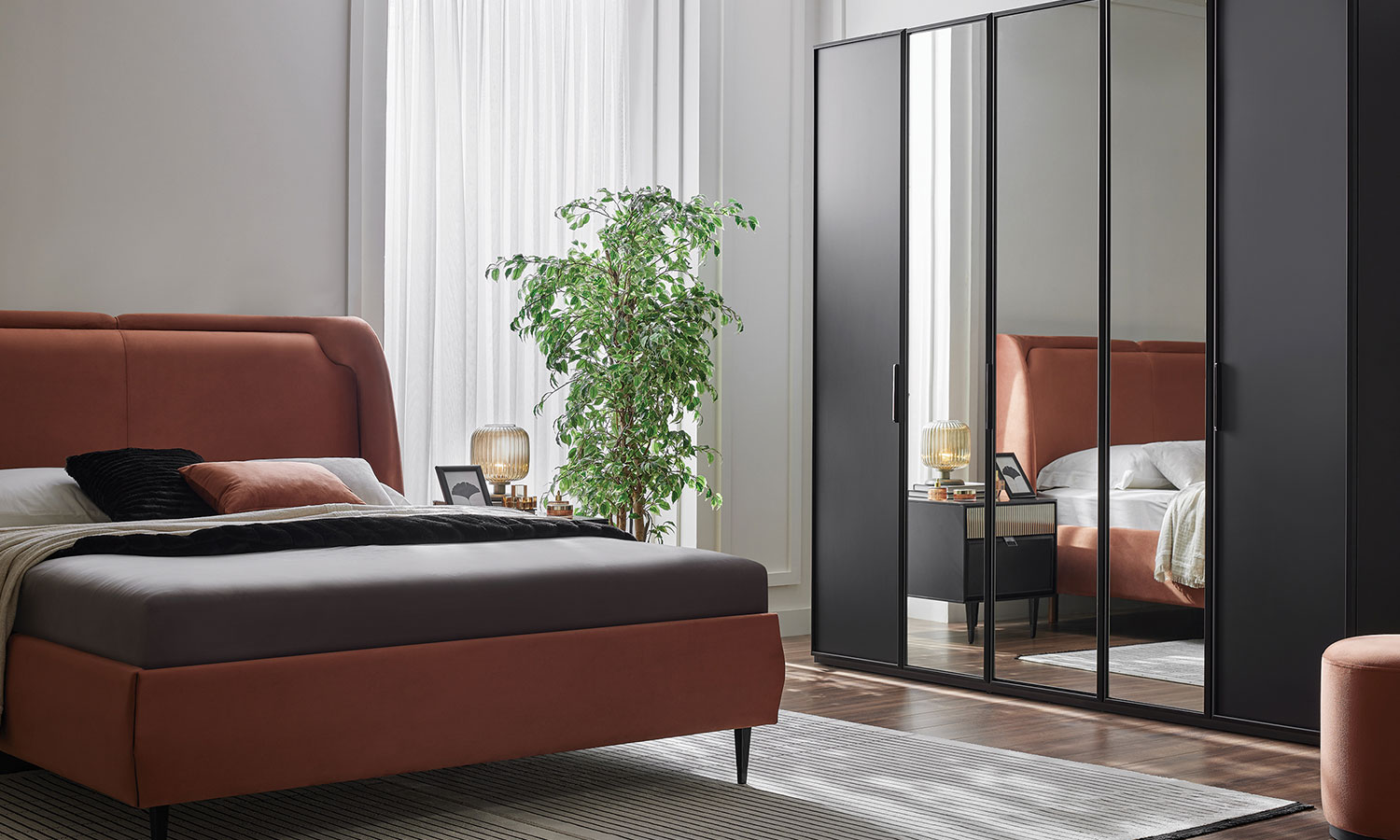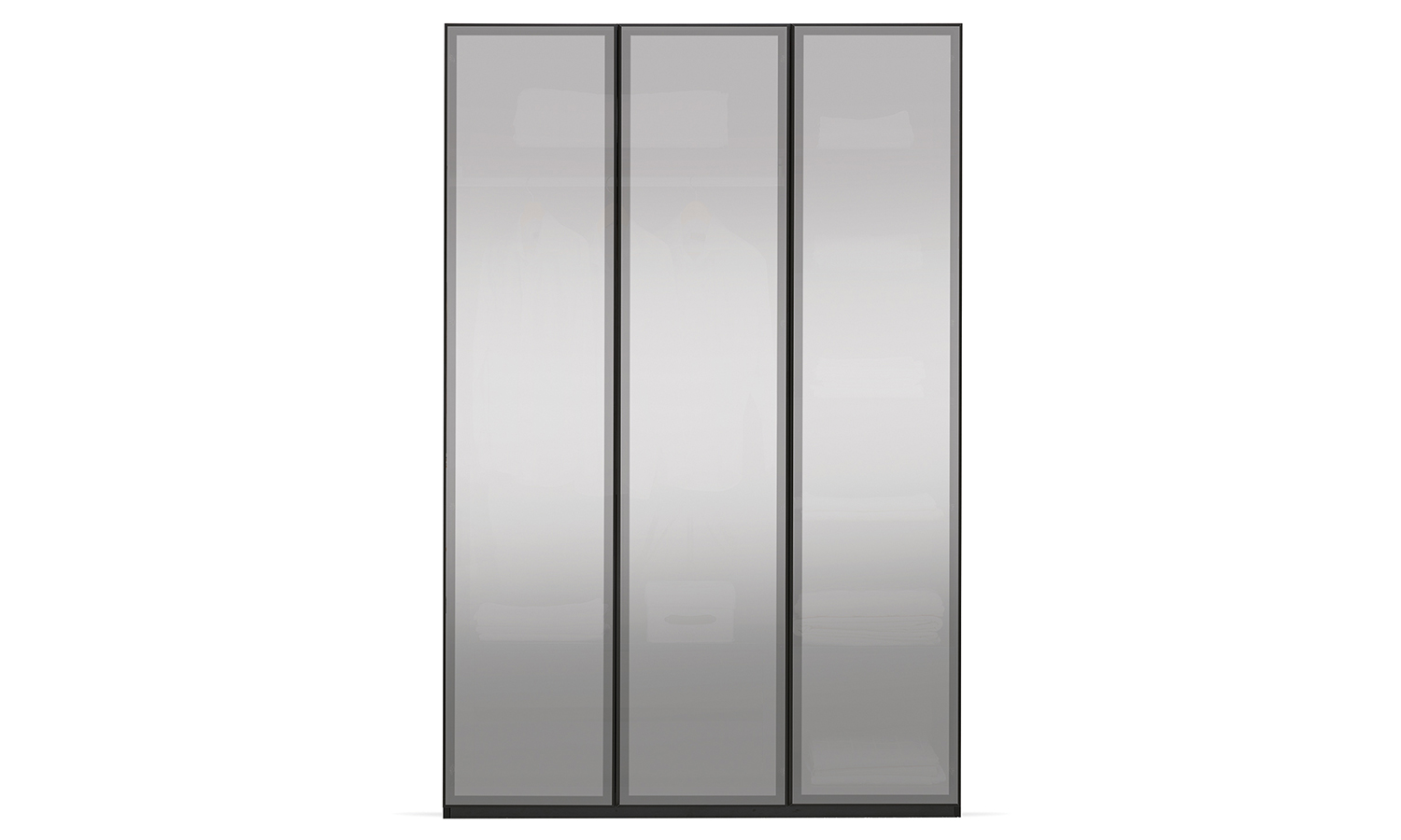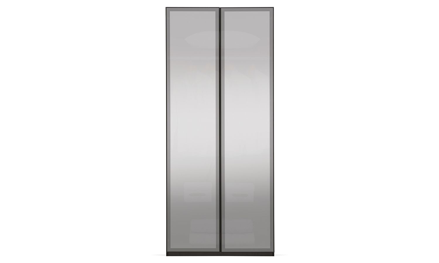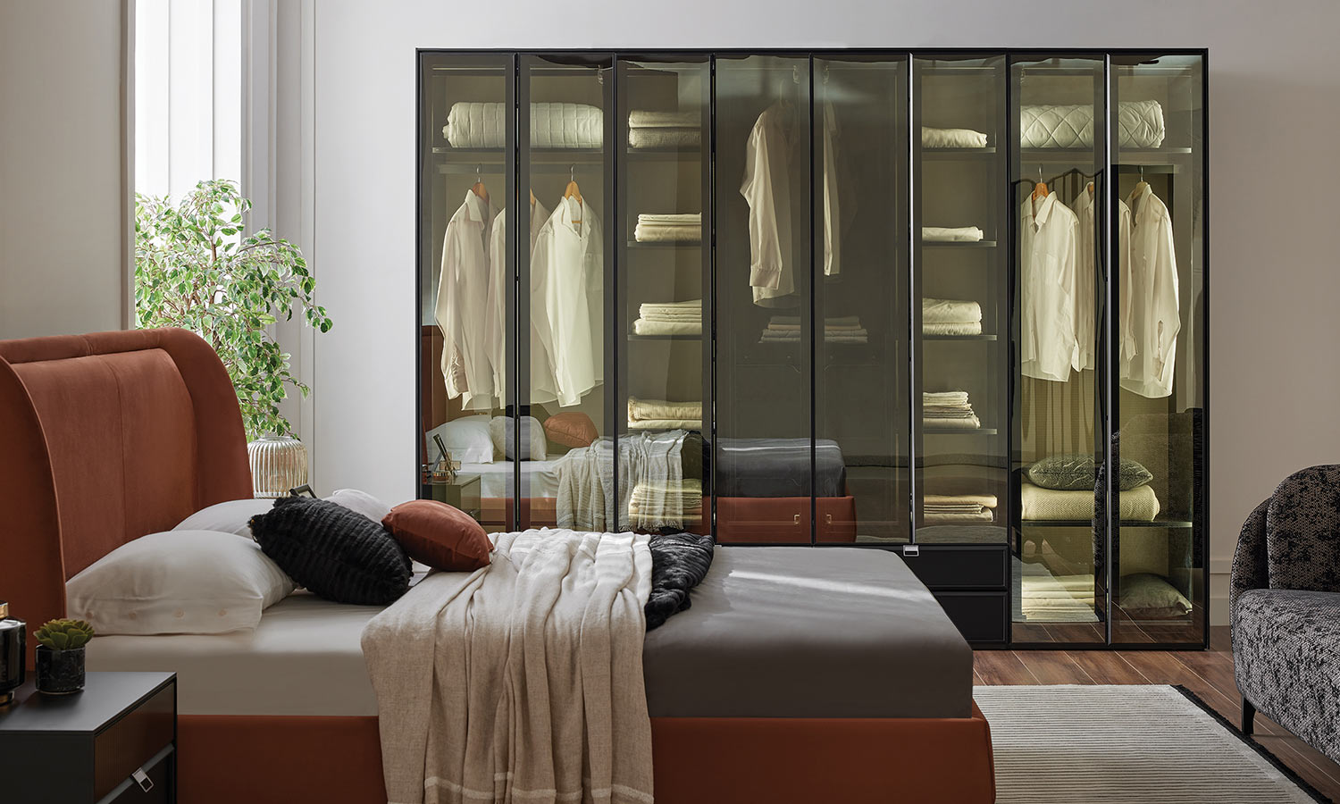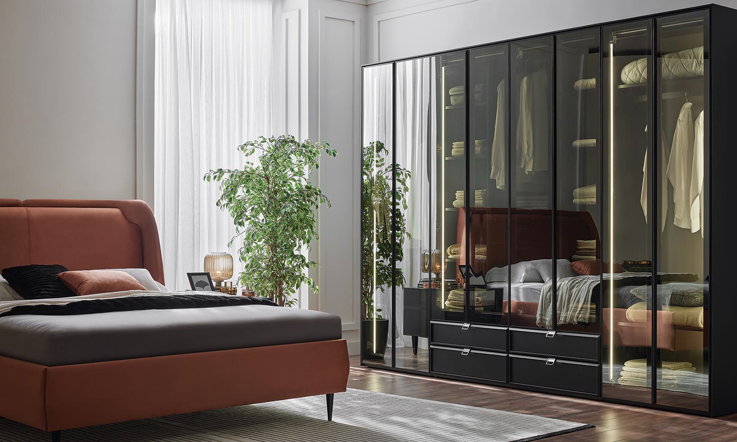 8-door wardrobe with folding doors, 3-door, 2-door and corner door wardrobes; aluminum frame cover, fumed reflected glass and tall profile applications, natural mirror use on doors of 5-door wardrobe