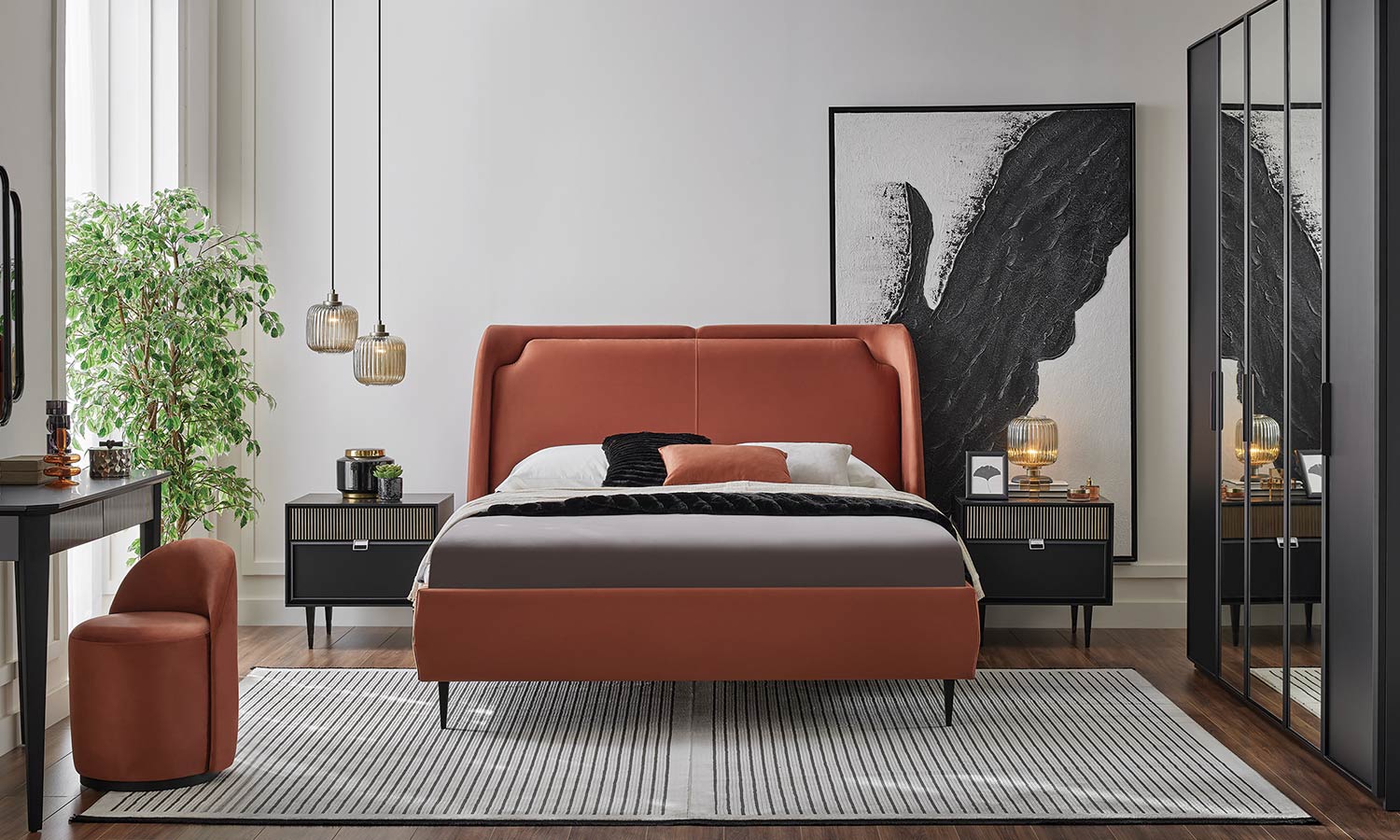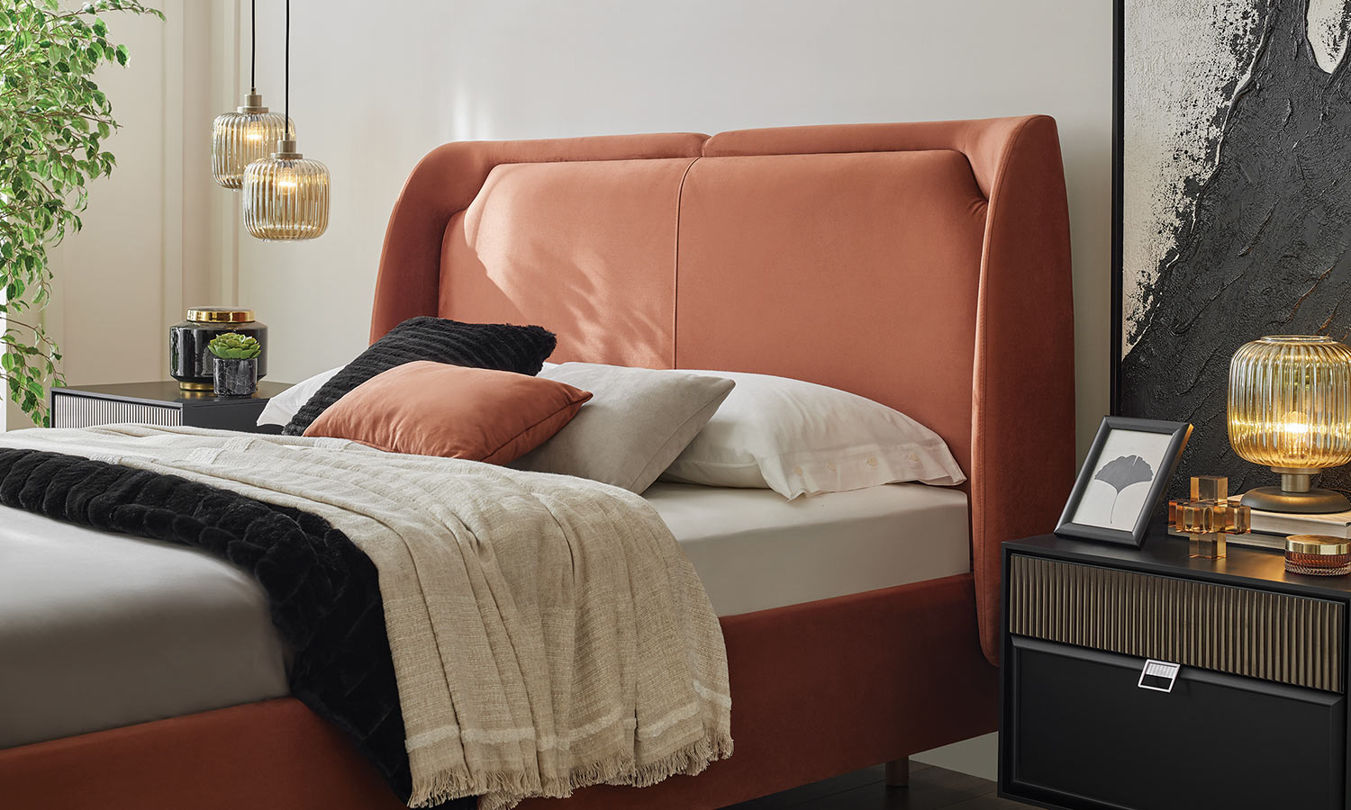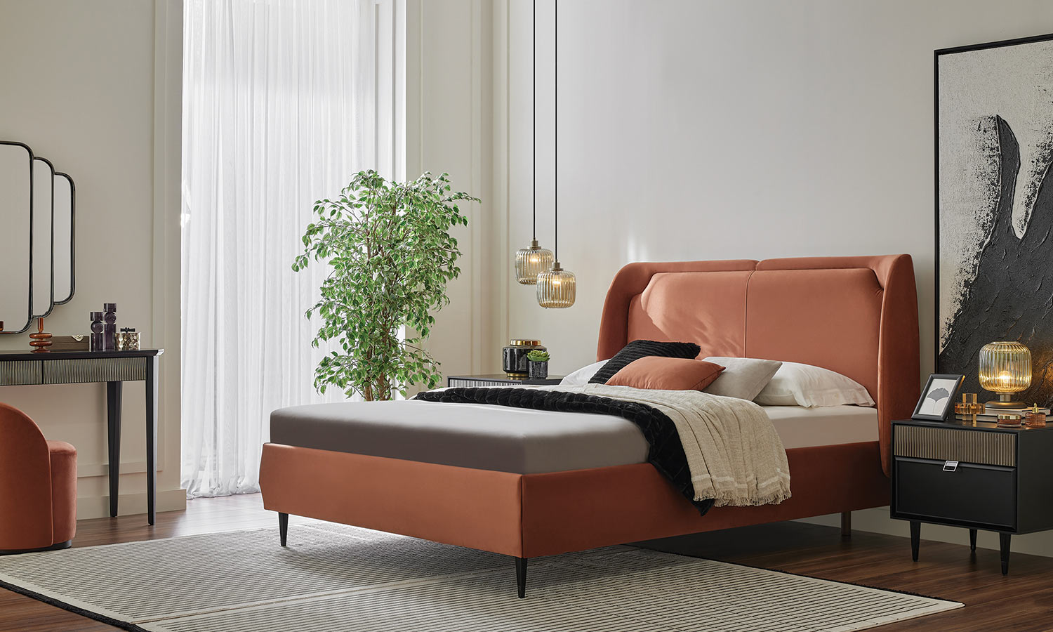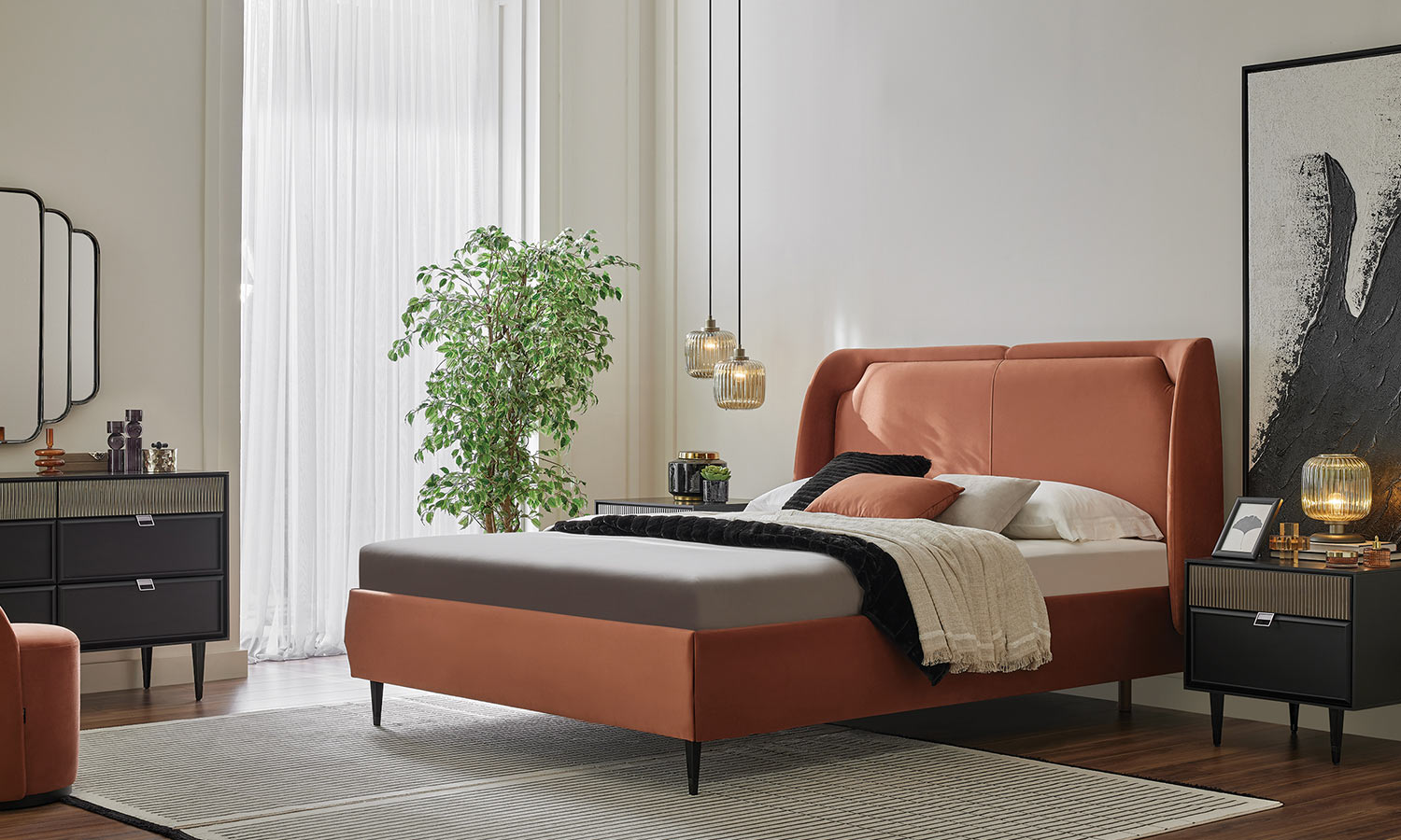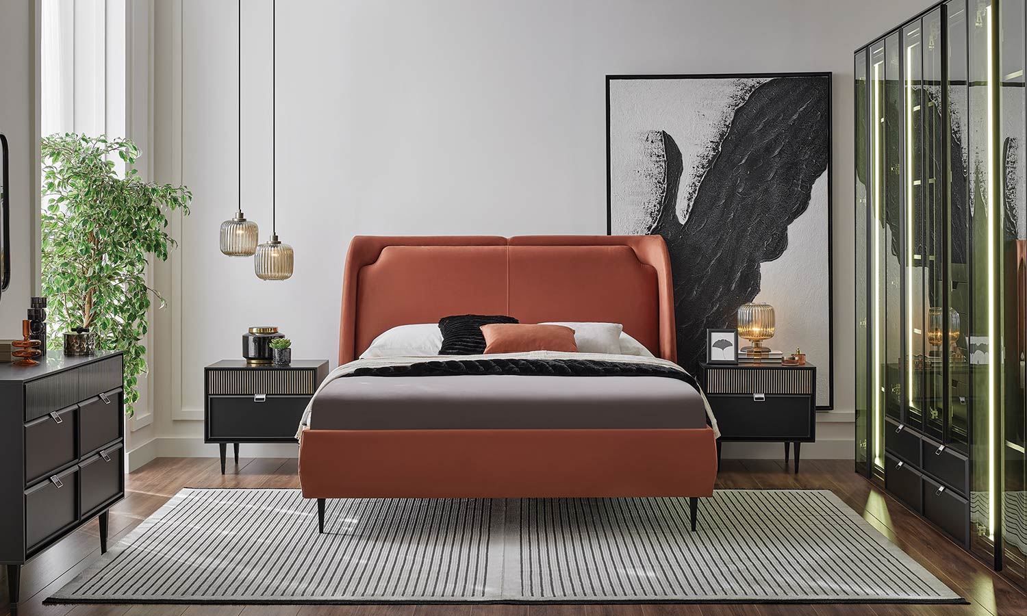 Upholstered bedframe and functional base option with compartments in an elegant design without legs