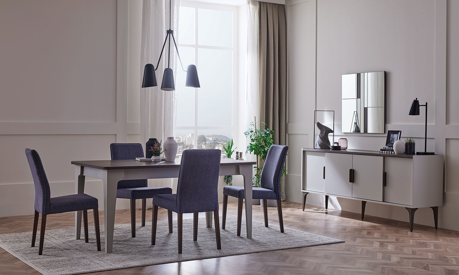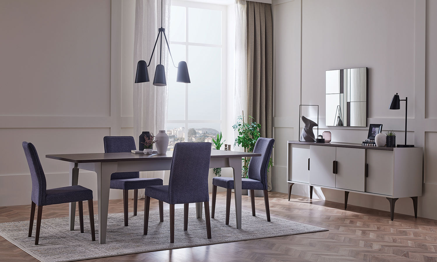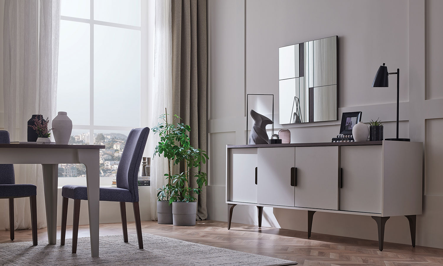 • Use of thick and wooden decorated top layers on the sideboard and the dining table