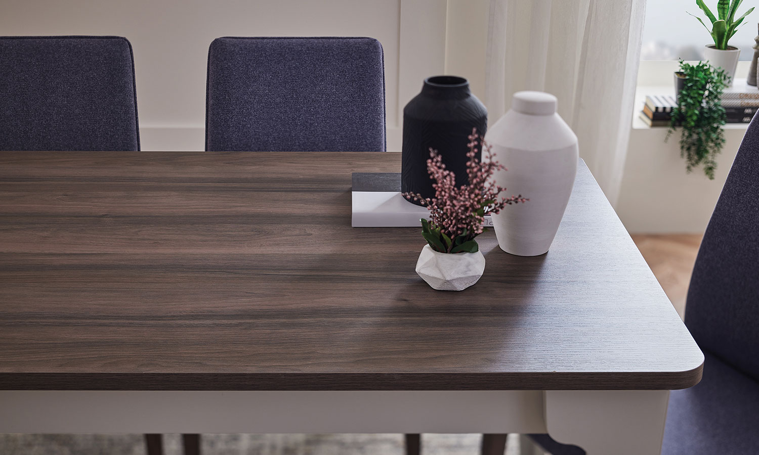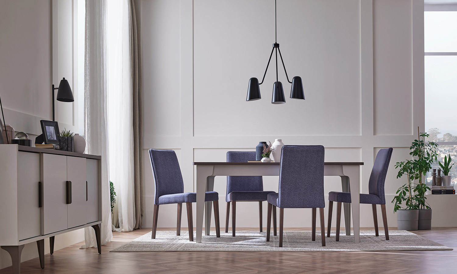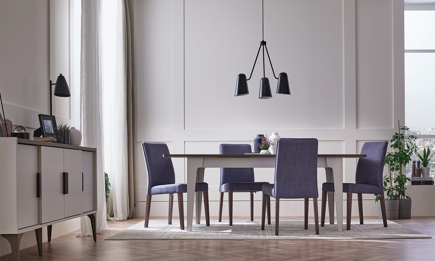• Use of thick and wooden decorated top layers on the sideboard and the dining table
