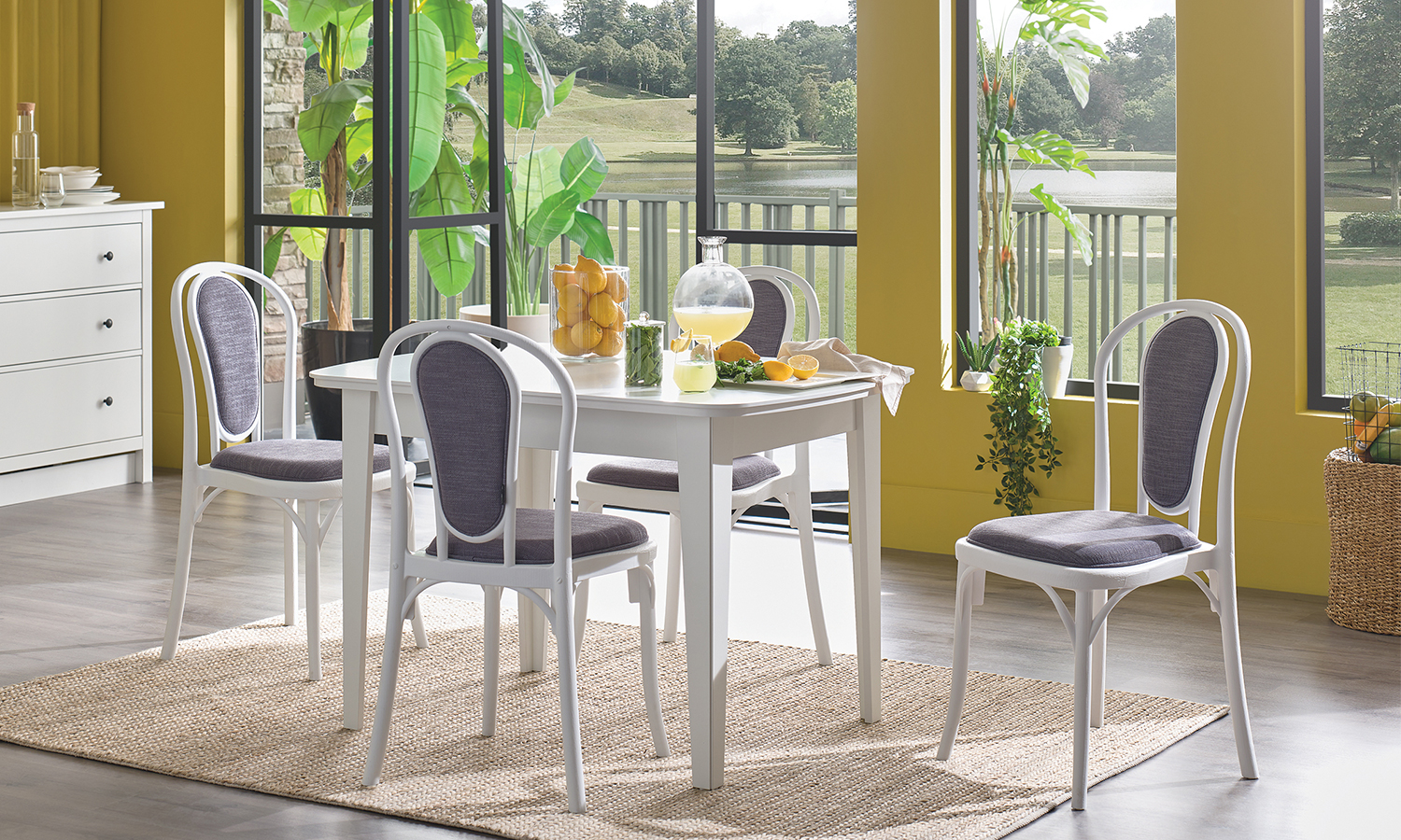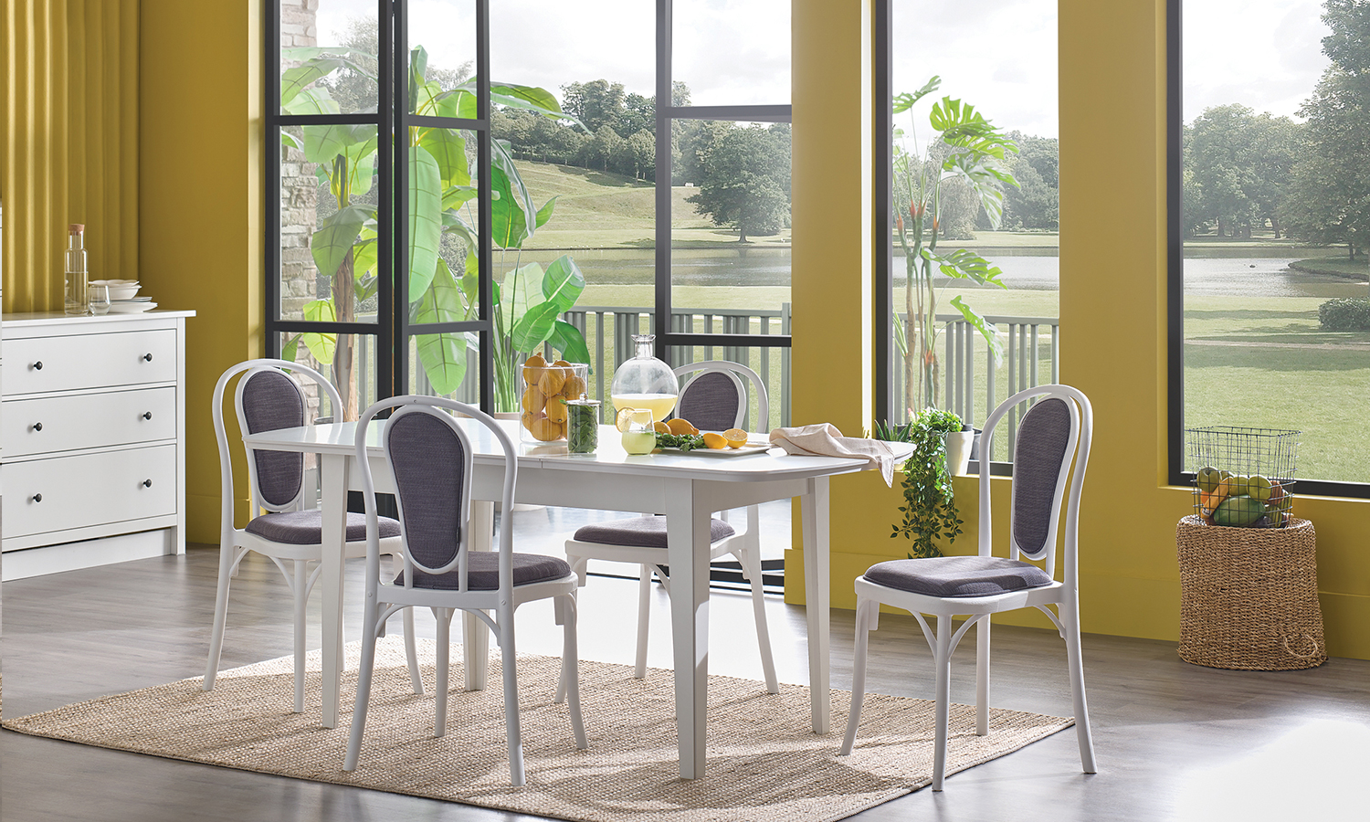 With its white colour, symbolizing the pureness and elegance, Rima Kitchen Table brings a new touch to your kitchen with its contemporary style. While it offers table alternatives as fixed and extendable, its minimal size is ideal for every kitchen. Extendable table ensures a spacious place for your family and loved ones in Sunday breakfasts. Providing a comfortable seating with its upholstery applied on its chair, Rima Kitchen Table will add a contemporary mood to your living space with its lean elegance.