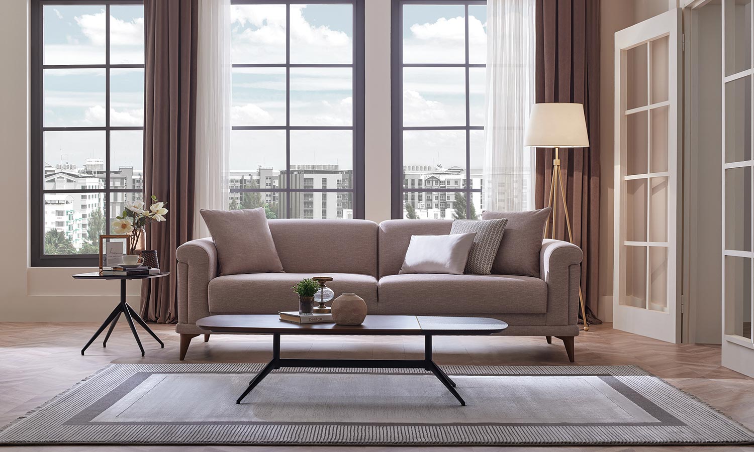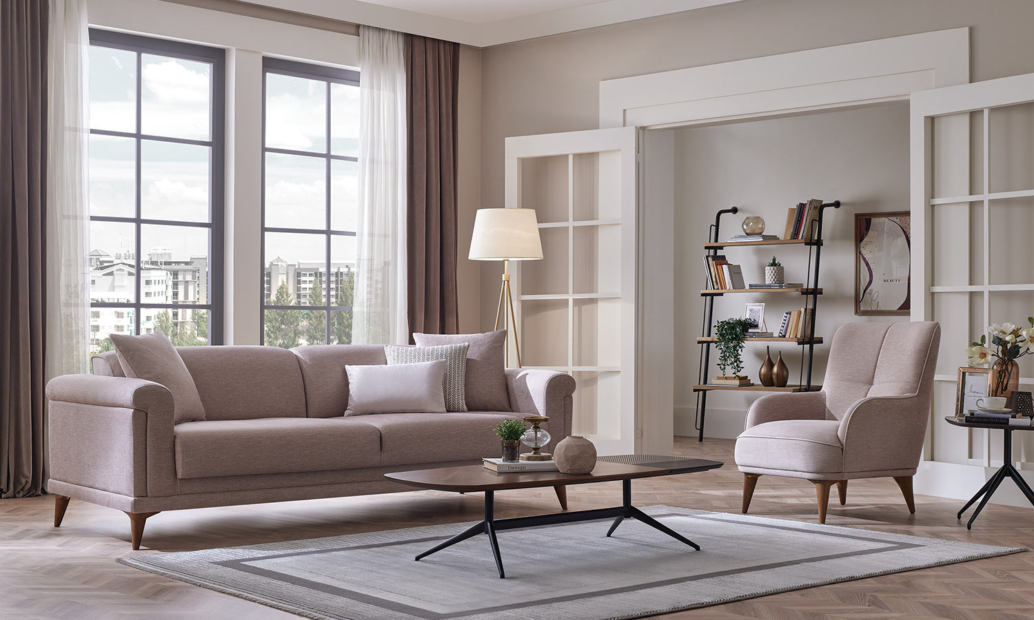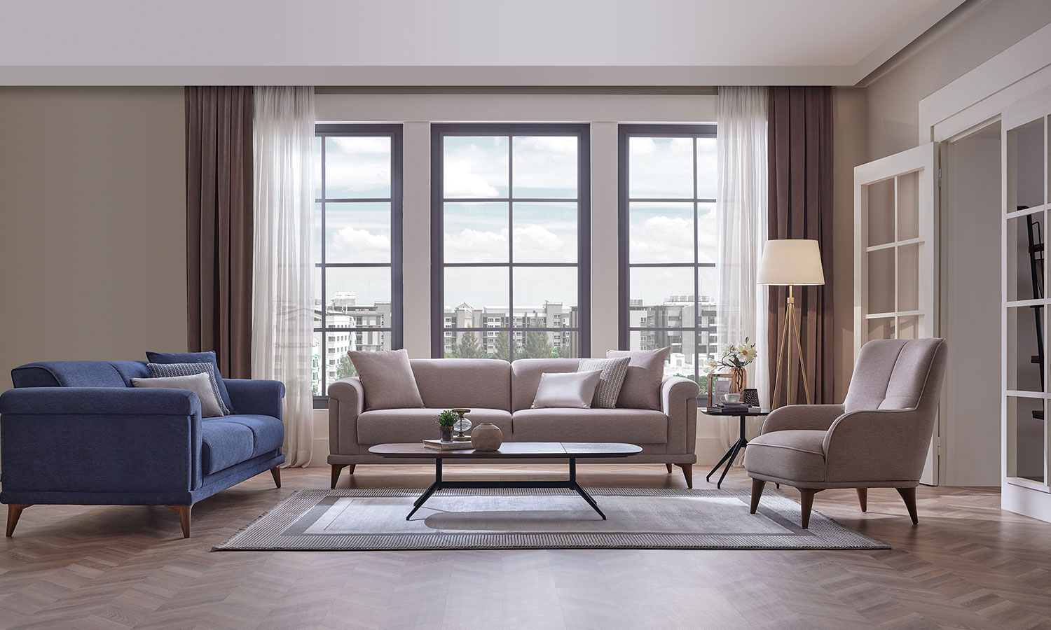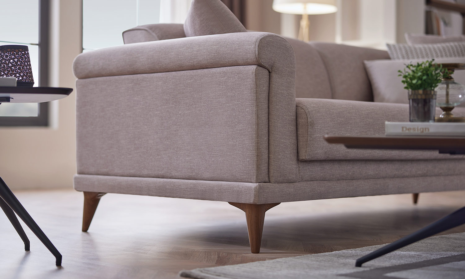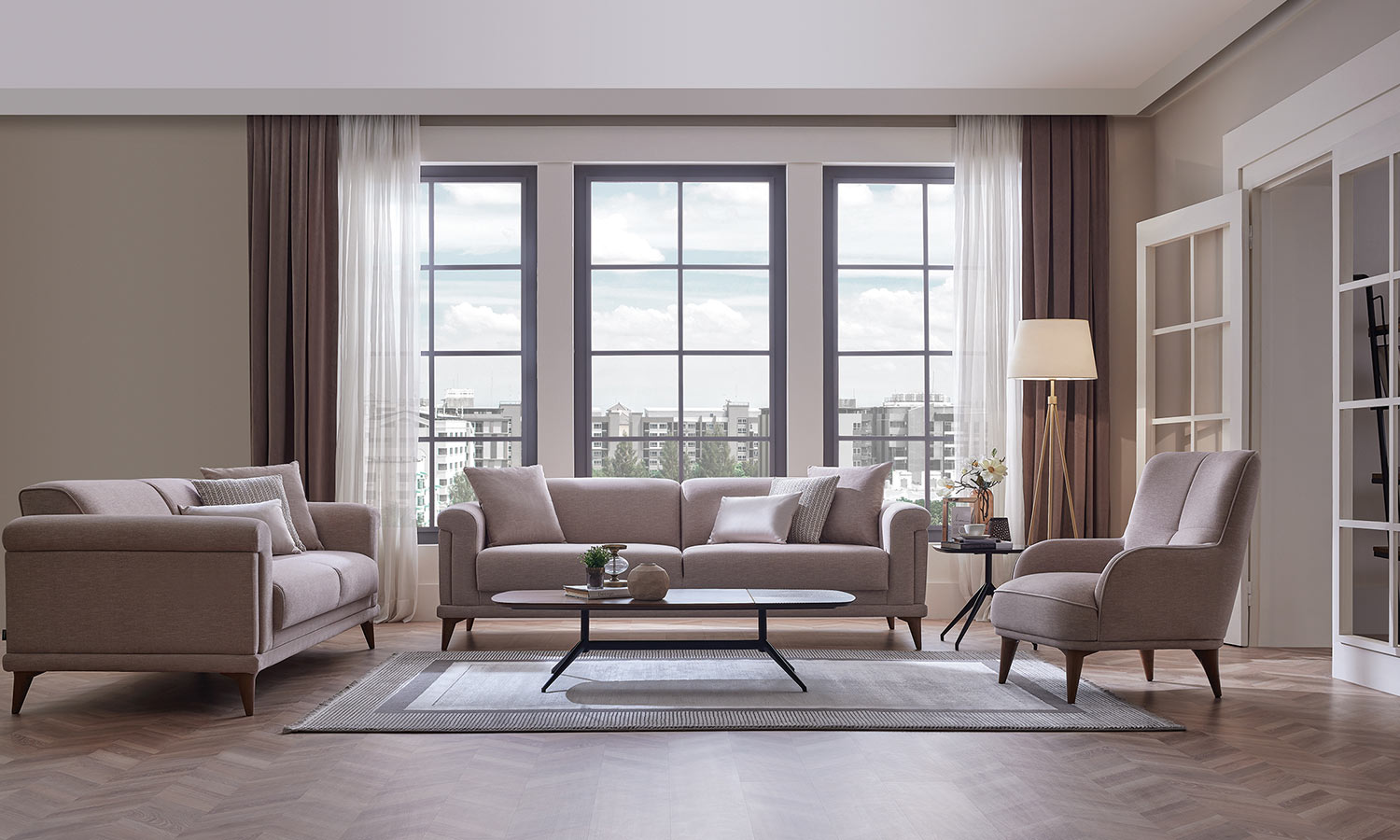 Melvin Living Room, which prioritizes comfort and convenience, maximizes the comfort you are looking for in your living space with its velvet- and linen-looking fabric alternatives and highly comfortable seating structure.