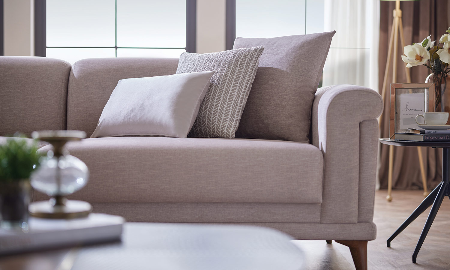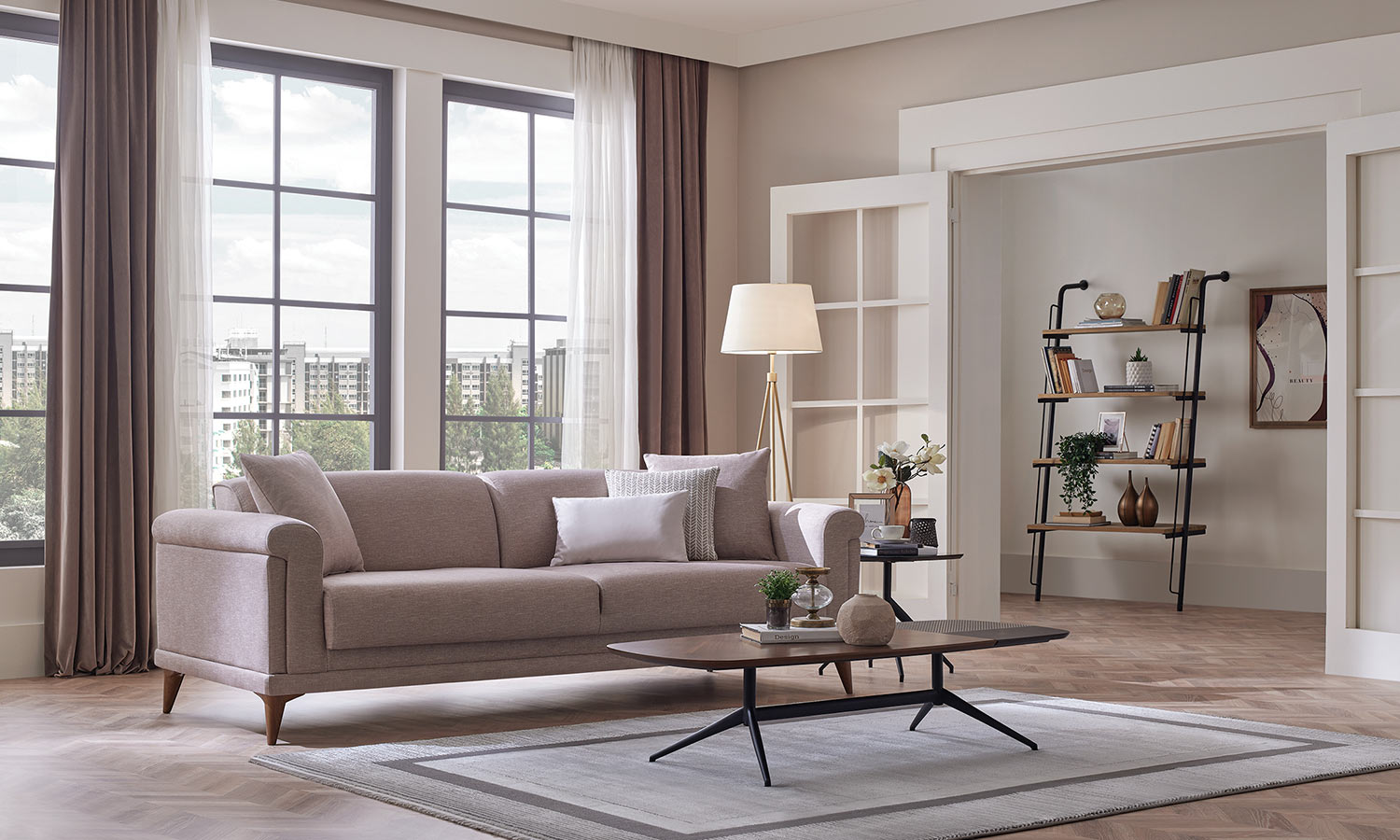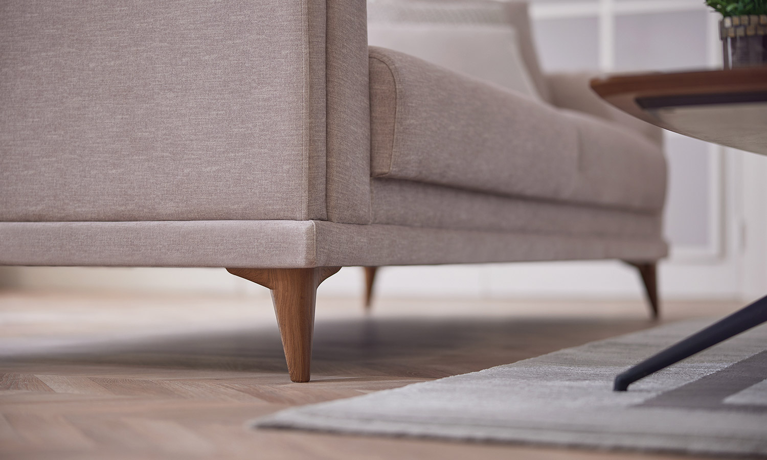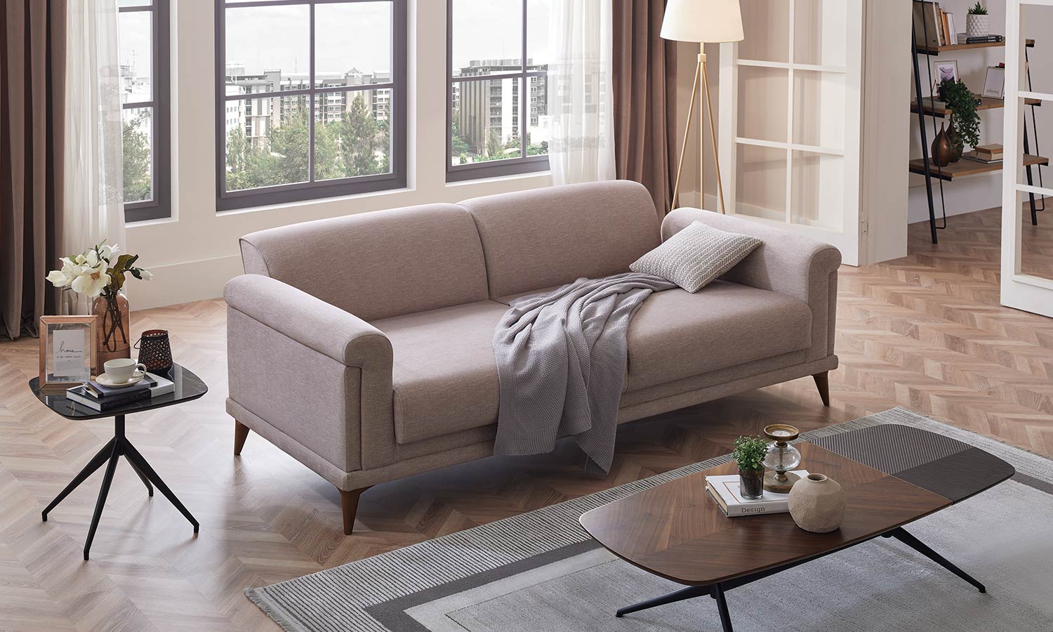 Melvin Living Room, which prioritizes comfort and convenience, maximizes the comfort you are looking for in your living space with its velvet- and linen-looking fabric alternatives and highly comfortable seating structure.
