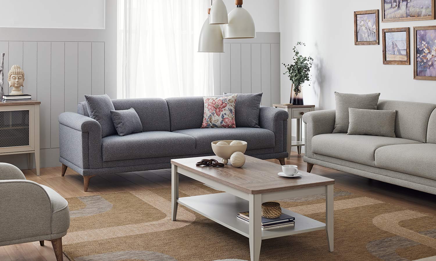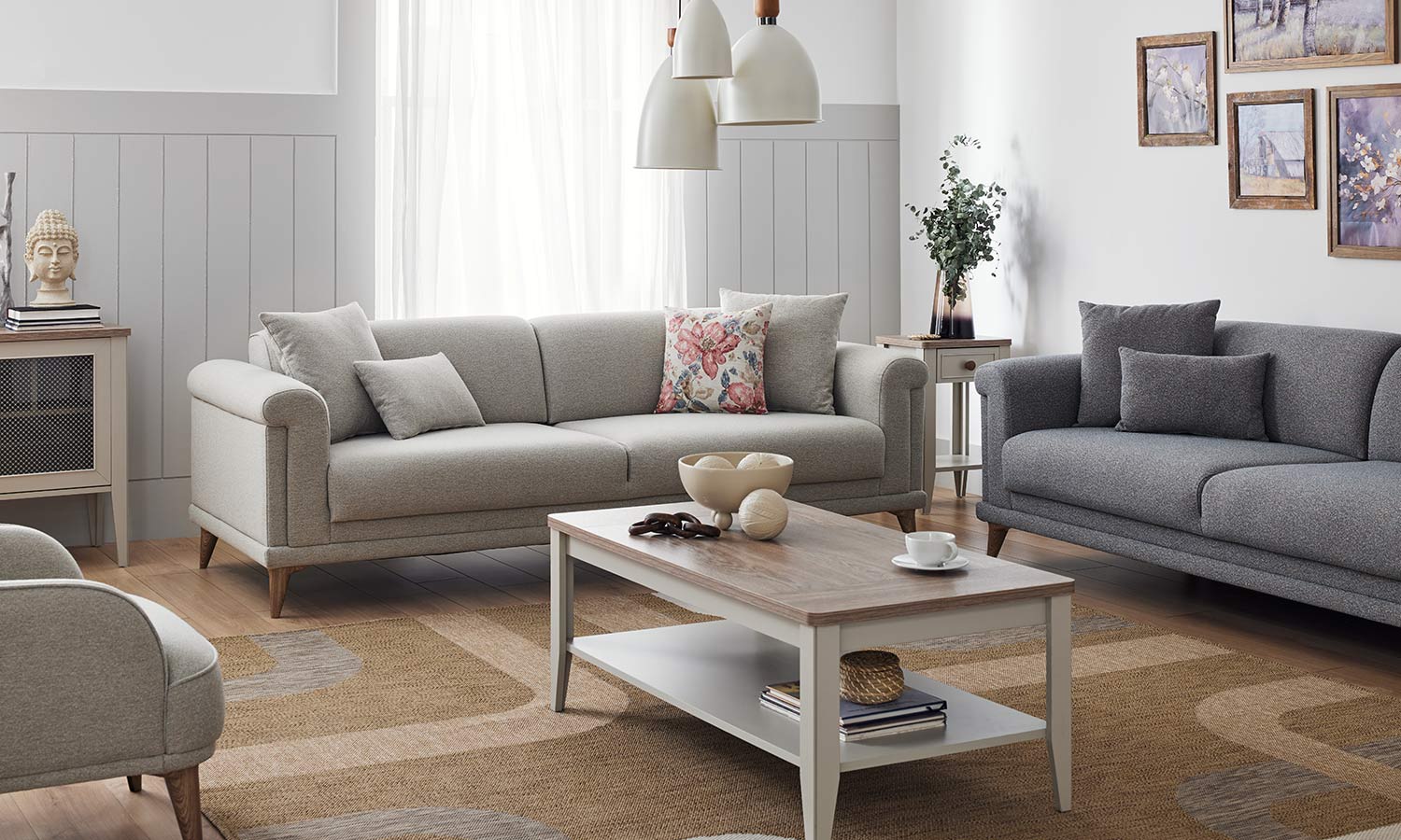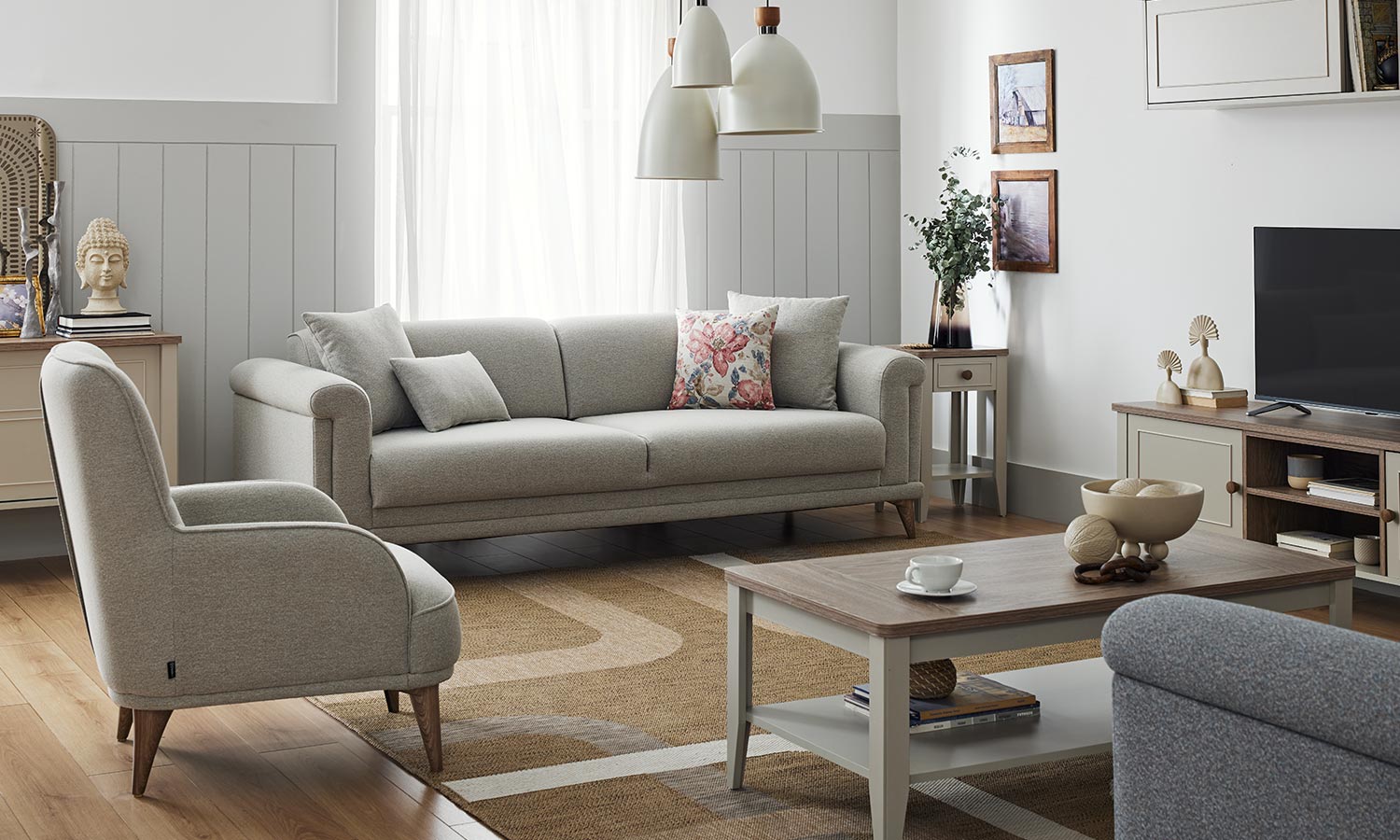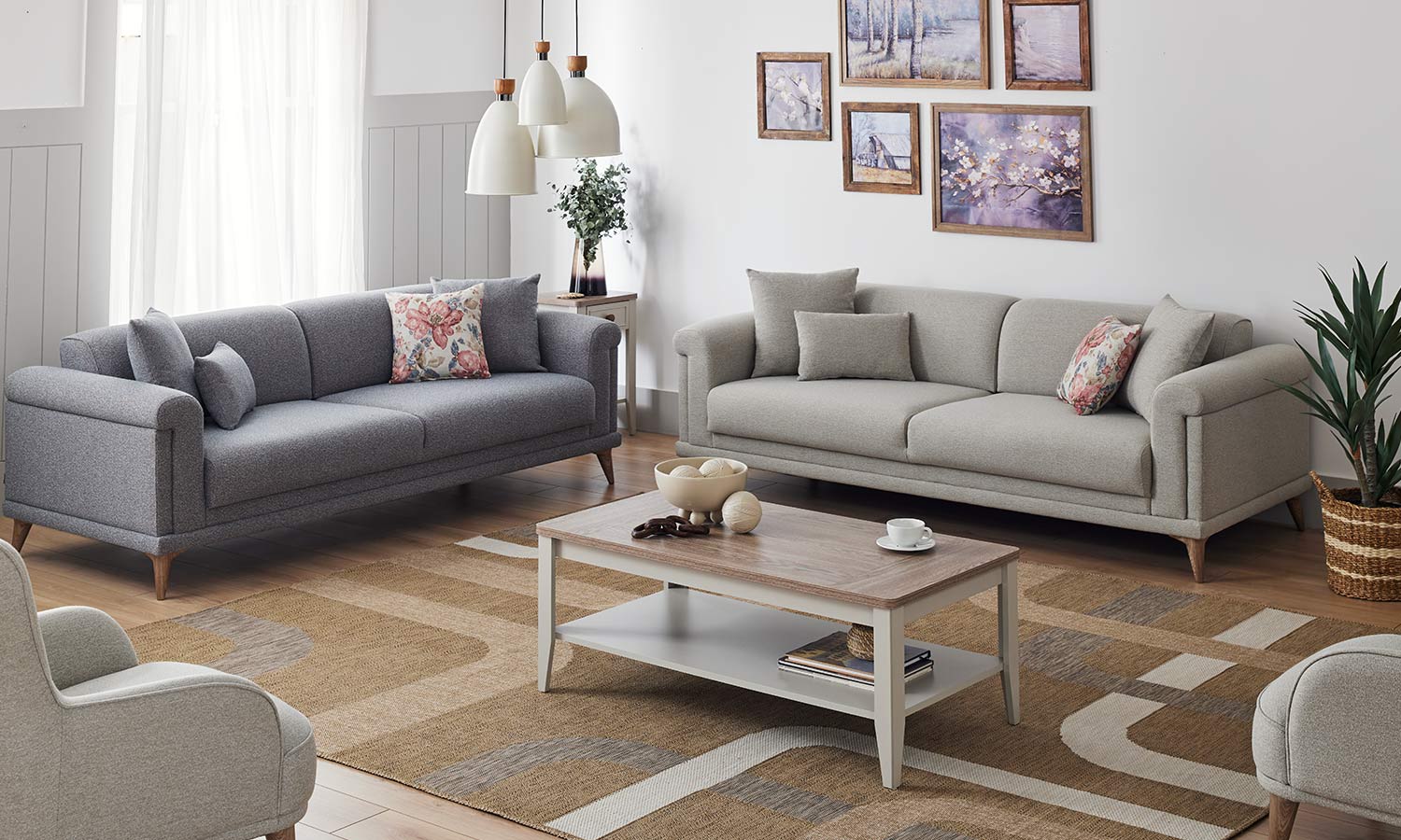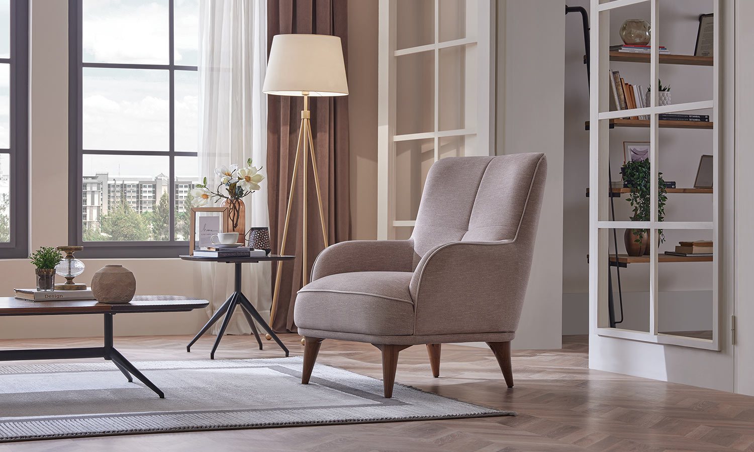 Melvin Living Room, which prioritizes comfort and convenience, maximizes the comfort you are looking for in your living space with its velvet- and linen-looking fabric alternatives and highly comfortable seating structure.