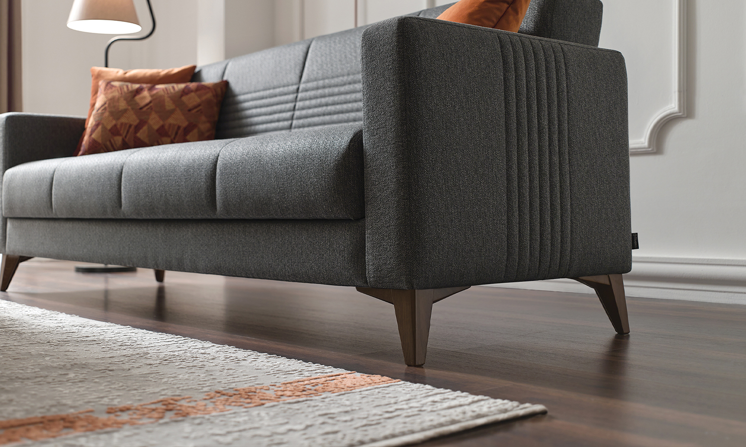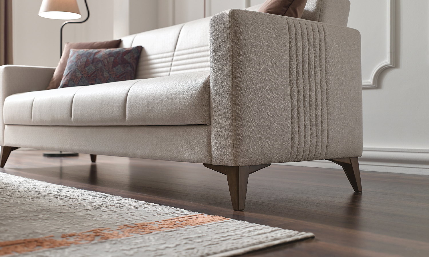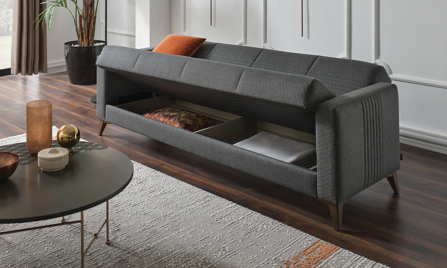 Nola Living Room will suit your home very well with its modern stance and unique color combinations. In addition to its elegance, the 3-seat sofa can easily be transformed into a bed, while the storage base feature offers you the additional storage space that you need in your living space. With velvet and linen fabric alternatives and walnut colored legs, the Nola Living Room will be the new face of comfort in homes.