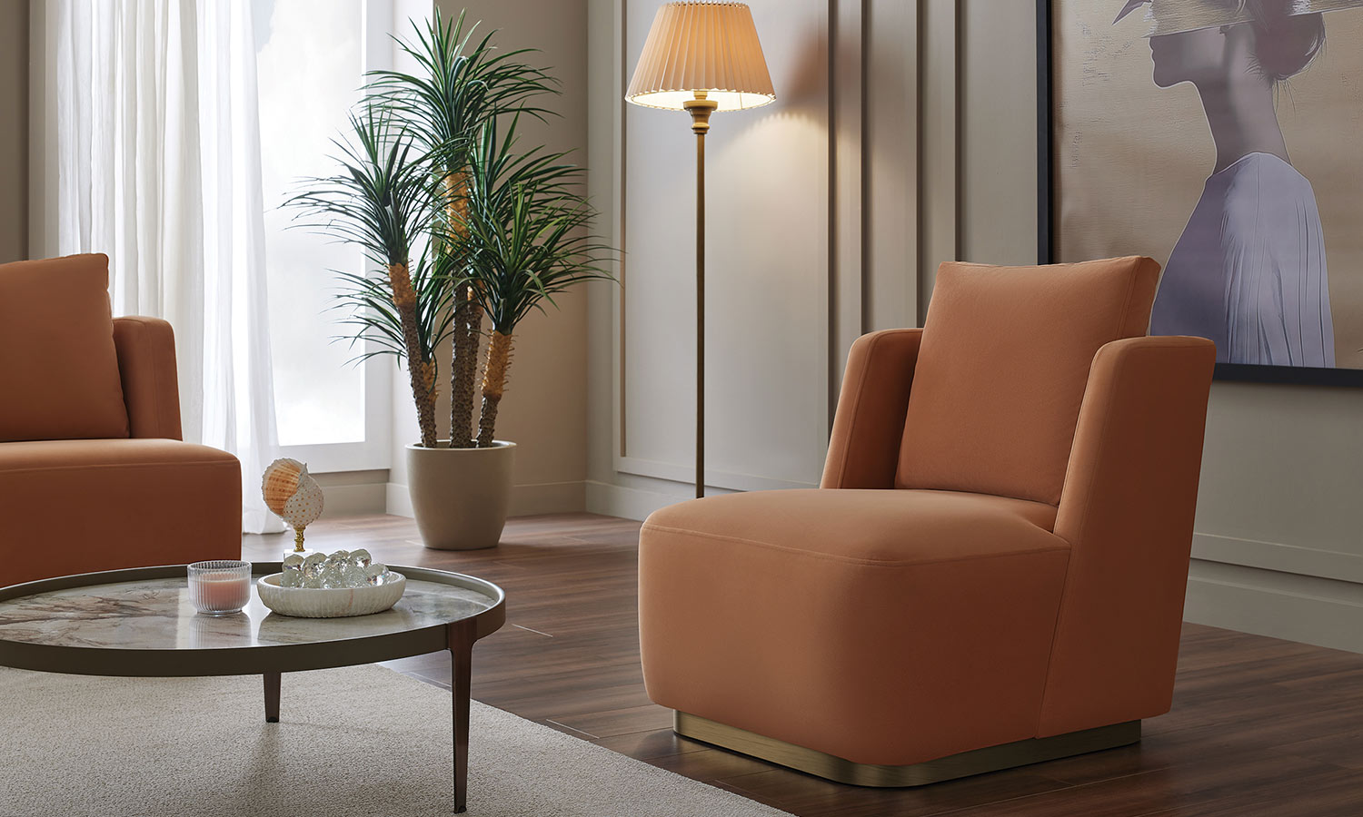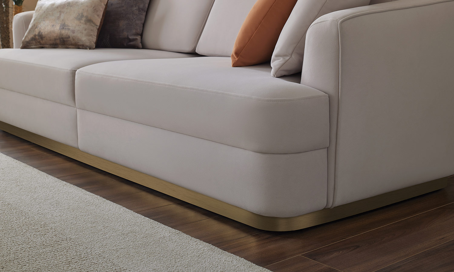 The Olimpia Living Room with Storage offers an eye-catching decoration, and it comes in a variety of fabric options, including linen and velvet. Warmth and refinement are infused into the design with storage base alternatives in walnut and bronze tones.