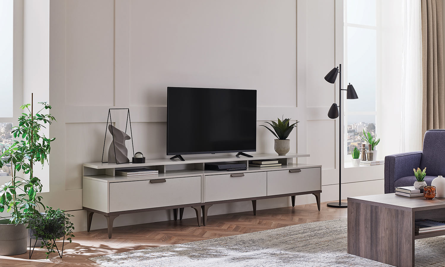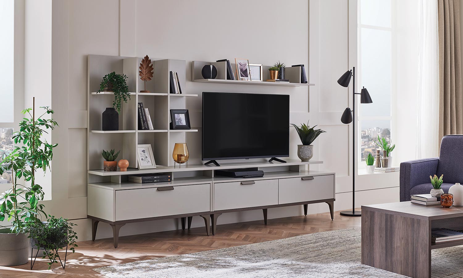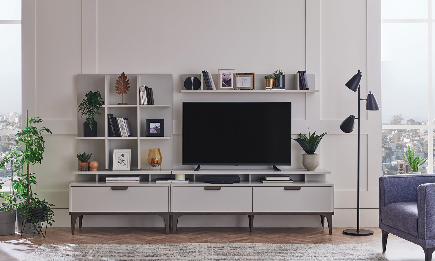 Combining a modular structure with functionality, the Morel TV Unit brings a new style to living spaces by complementing its modern design with matte gray handles and compatible legs. Alternative Morel TV Unit modules and the wall module with shelves, which can be used also as a bookcase, allow you to design the ideal living space for yourselves.