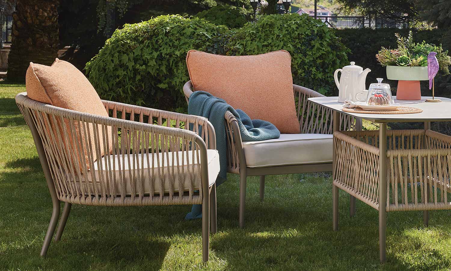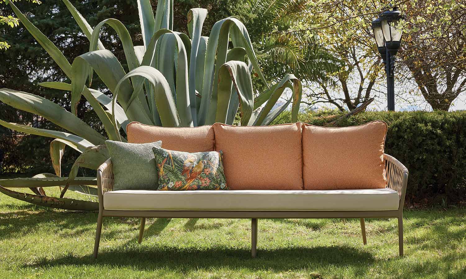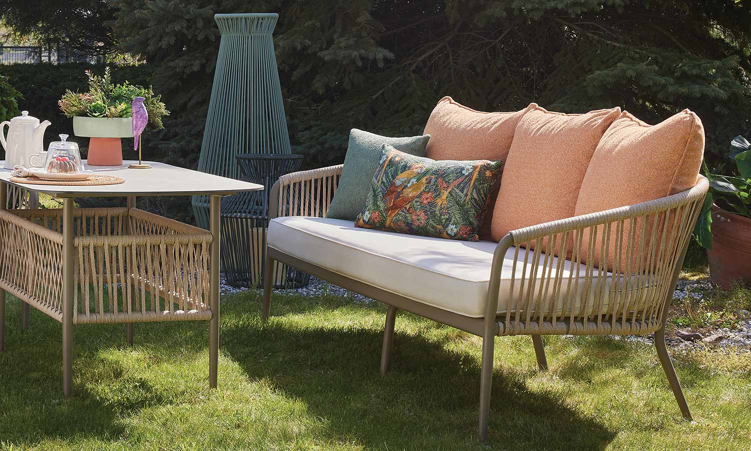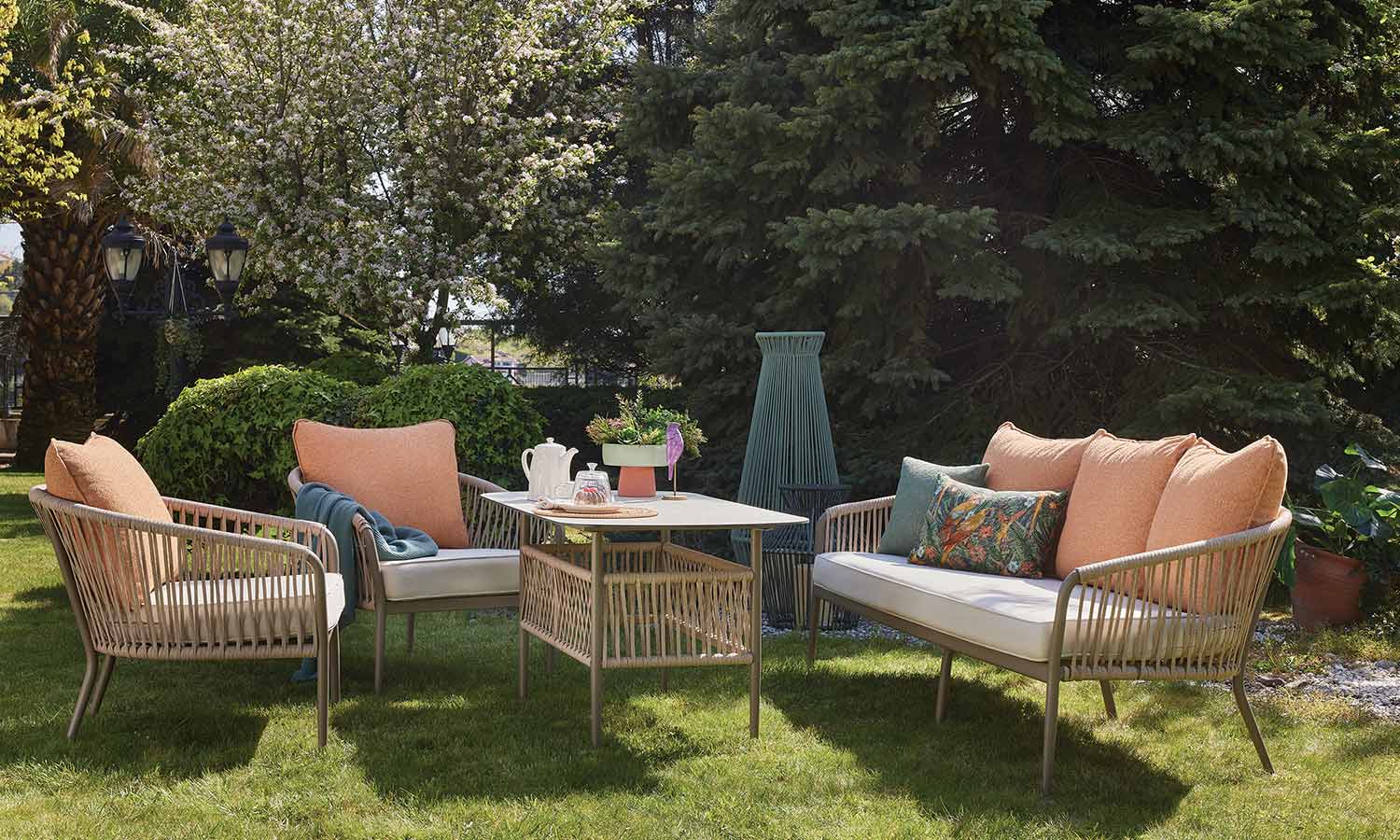 The Mirabel Sofa Suite, combining traditional style with modern details, brings elegance to the outdoor spaces with its conical pipe profile structure and pastel-toned throw pillows. The three-seat sofa option makes it exceptionally versatile for large parties. While the beige rope details and marble patterned coffee table top achieve a natural harmony, the high-legged coffee tables offer a functional area from breakfast to evening chats. Mirabel is indispensable for those who want to create a peaceful atmosphere on spacious terraces and verandas.