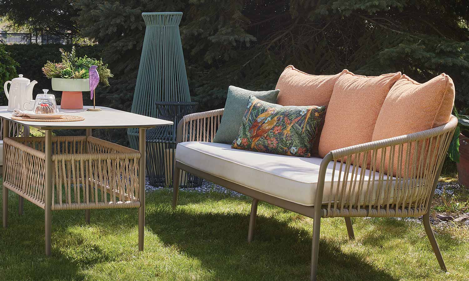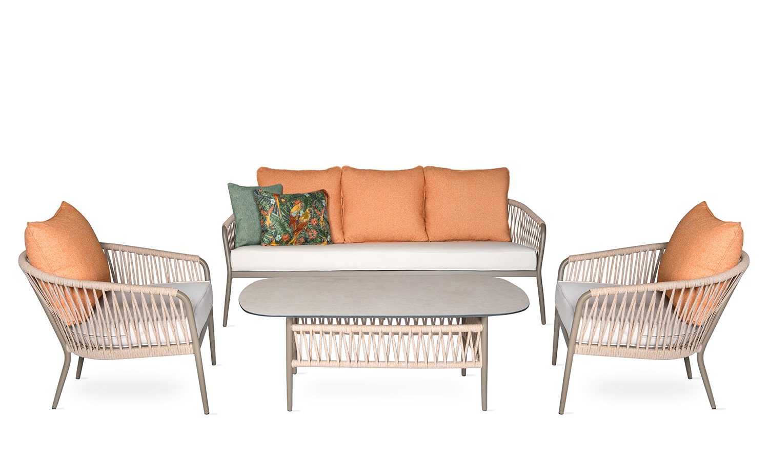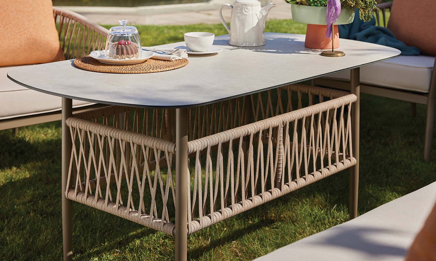 The Mirabel Sofa Suite, combining traditional style with modern details, brings elegance to the outdoor spaces with its conical pipe profile structure and pastel-toned throw pillows. The three-seat sofa option makes it exceptionally versatile for large parties. While the beige rope details and marble patterned coffee table top achieve a natural harmony, the high-legged coffee tables offer a functional area from breakfast to evening chats. Mirabel is indispensable for those who want to create a peaceful atmosphere on spacious terraces and verandas.