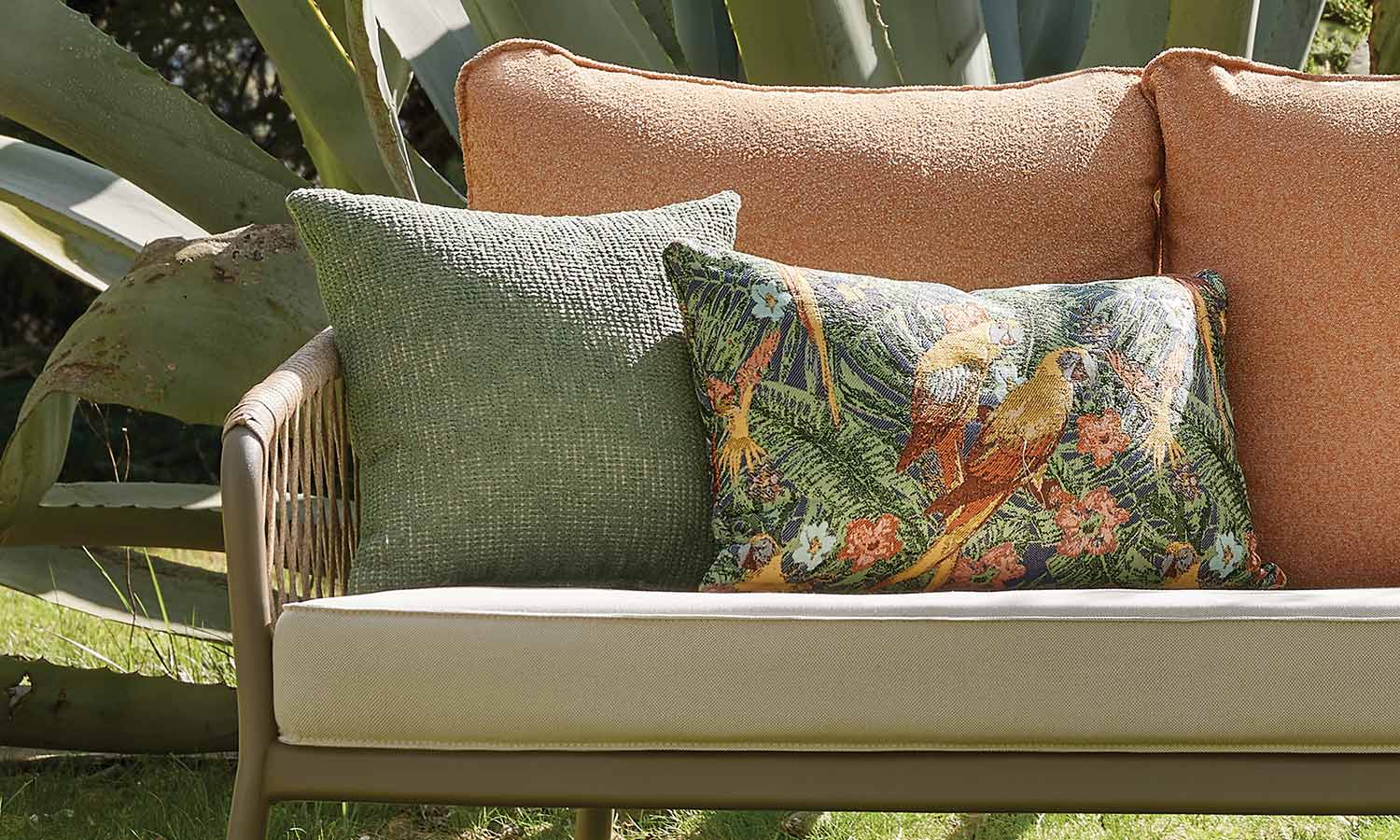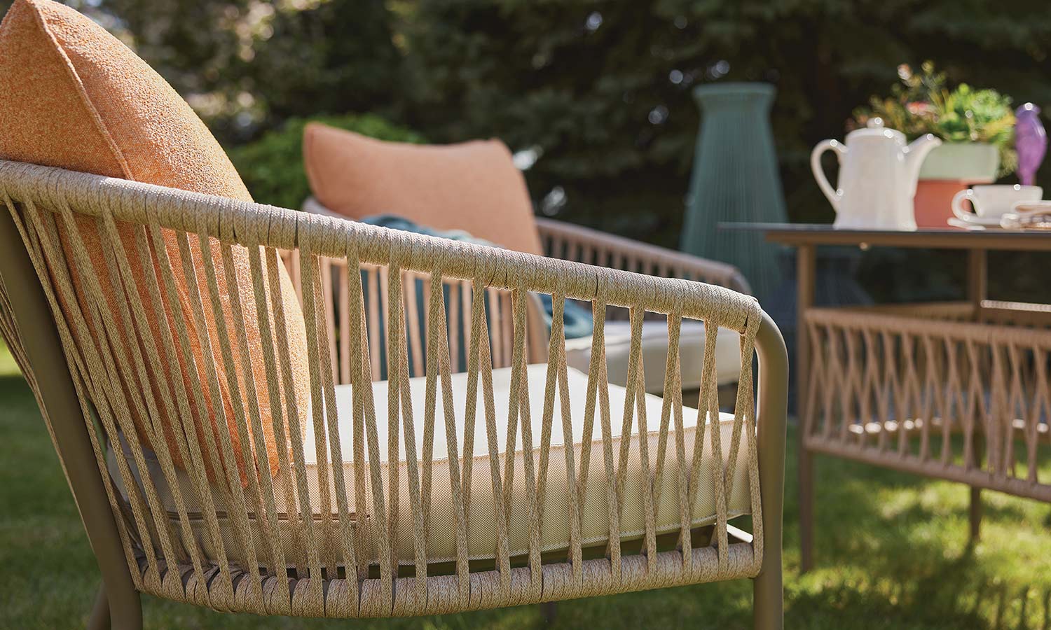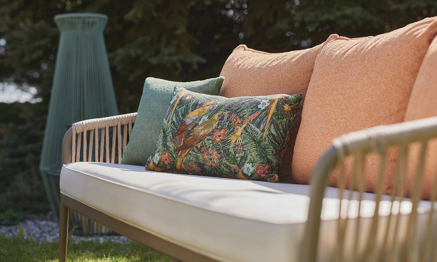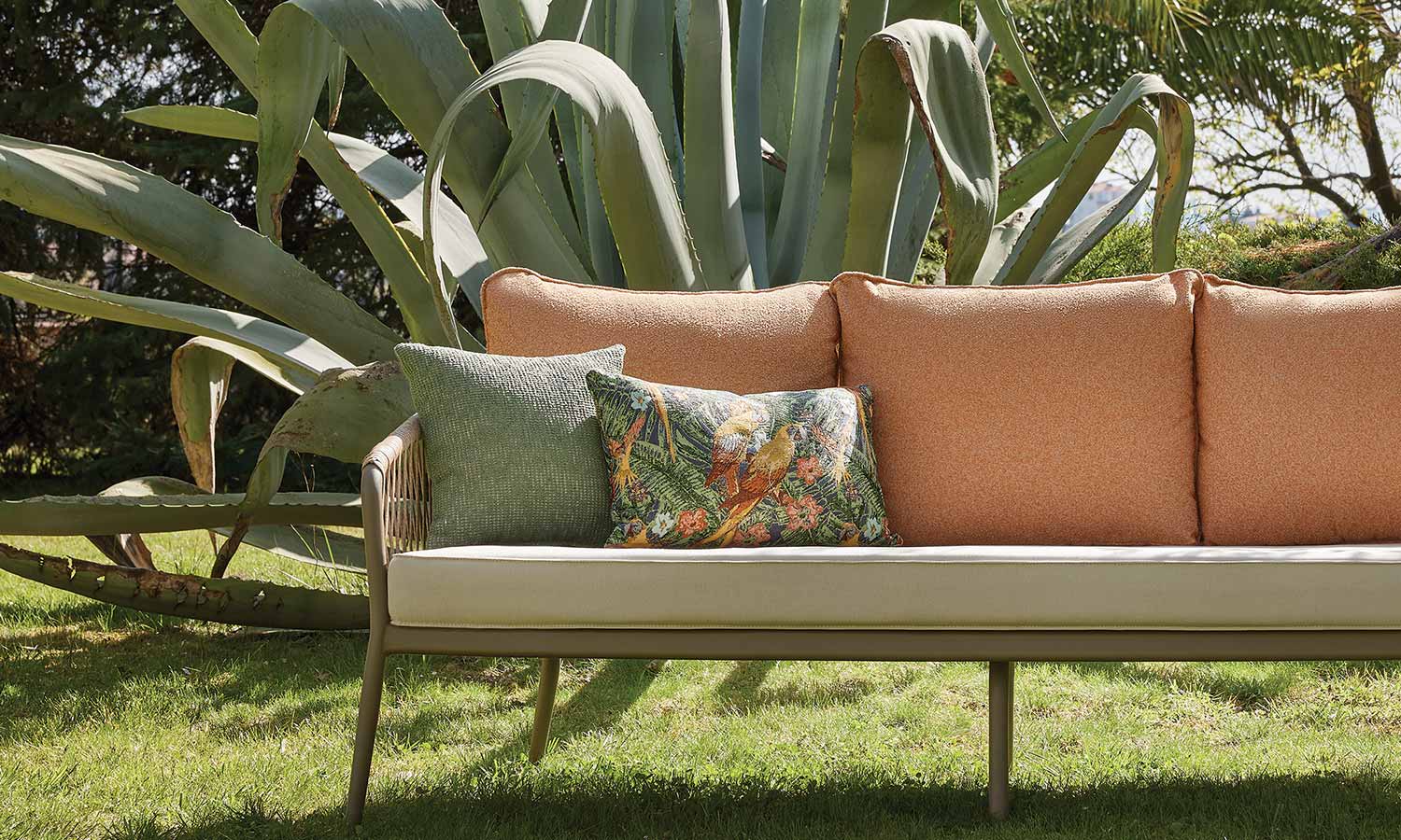 The Mirabel Sofa Suite, combining traditional style with modern details, brings elegance to the outdoor spaces with its conical pipe profile structure and pastel-toned throw pillows. The three-seat sofa option makes it exceptionally versatile for large parties. While the beige rope details and marble patterned coffee table top achieve a natural harmony, the high-legged coffee tables offer a functional area from breakfast to evening chats. Mirabel is indispensable for those who want to create a peaceful atmosphere on spacious terraces and verandas.