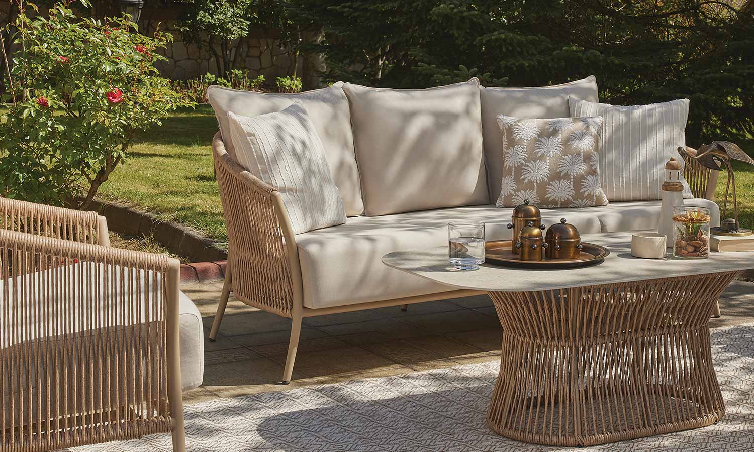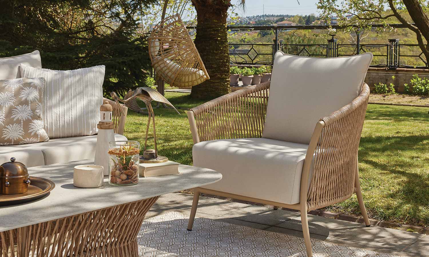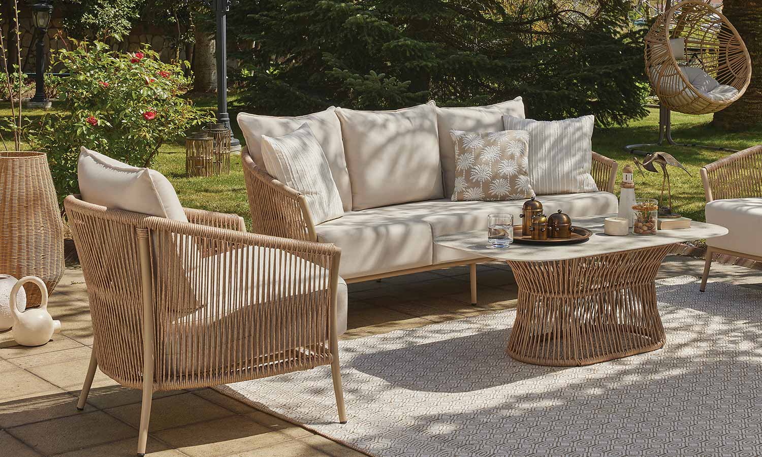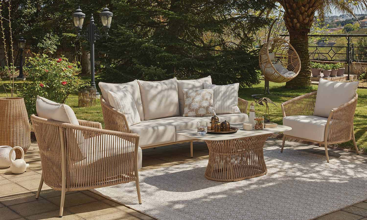 Reflecting the freshness of pastel tones in your garden, the Vanilla Sofa Suite brings comfort and aesthetics together. Puffy cushions bring the comfort of the interior to the outdoor, while beige rattan details create a warm atmosphere. Decorative throw pillows and balanced seating area allow long conversations and peaceful moments. Vanilla adds an elegant touch with its matte surface of the coffee table while offering a natural elegance to your outdoor space with its design.