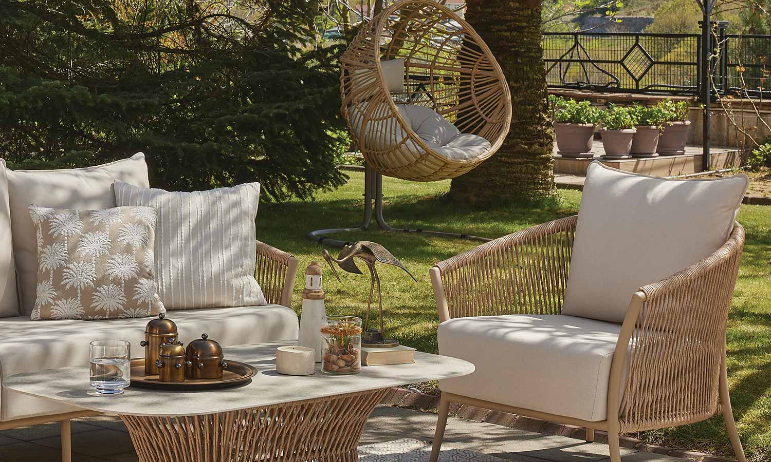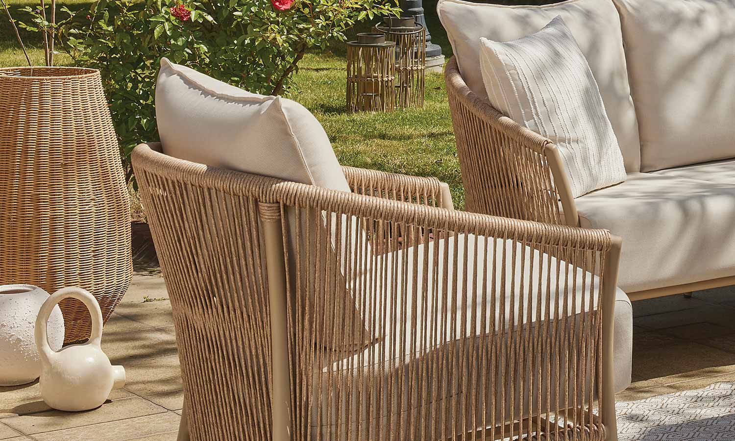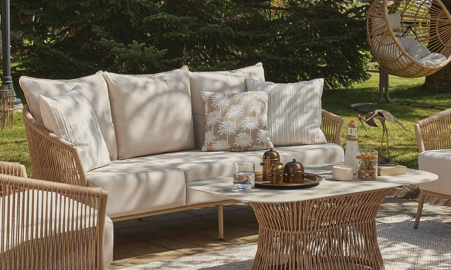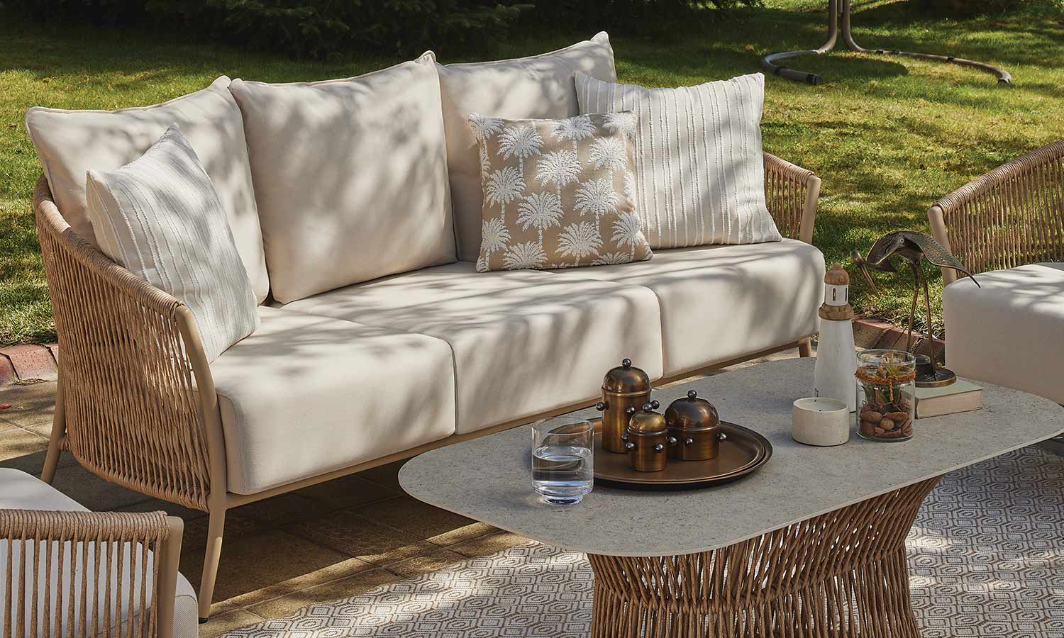 Reflecting the freshness of pastel tones in your garden, the Vanilla Sofa Suite brings comfort and aesthetics together. Puffy cushions bring the comfort of the interior to the outdoor, while beige rattan details create a warm atmosphere. Decorative throw pillows and balanced seating area allow long conversations and peaceful moments. Vanilla adds an elegant touch with its matte surface of the coffee table while offering a natural elegance to your outdoor space with its design.