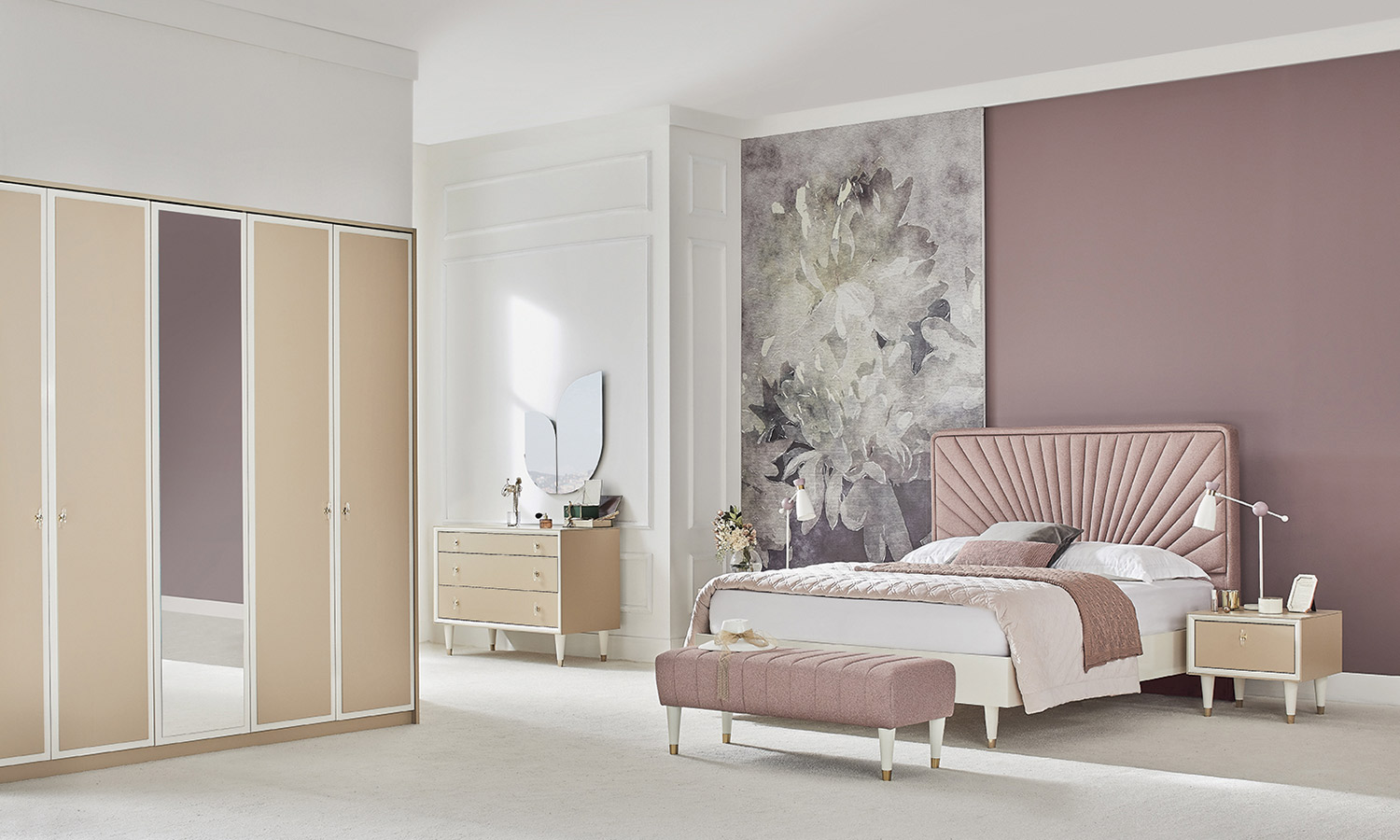 A design that combines contemporary style with classic elegance. Eva Bedroom impresses with its romantic colours and glittering details. In addition to the four and five door cabinet options, it offers useful areas with its practical sliding door cabinet module. The bedframe headboard, which distinguishes itself with special sewing details, has a warm and peaceful effect with its impressive visuality as well as colour alternatives. The dressing table, which is indispensable in traditional bedrooms, is one of the most popular parts of the latest decorations. Enriching its contemporary elegance with colour combination and Special design handles, Eva Bedroom brings you the contemporary and impressive bedroom of your dreams.