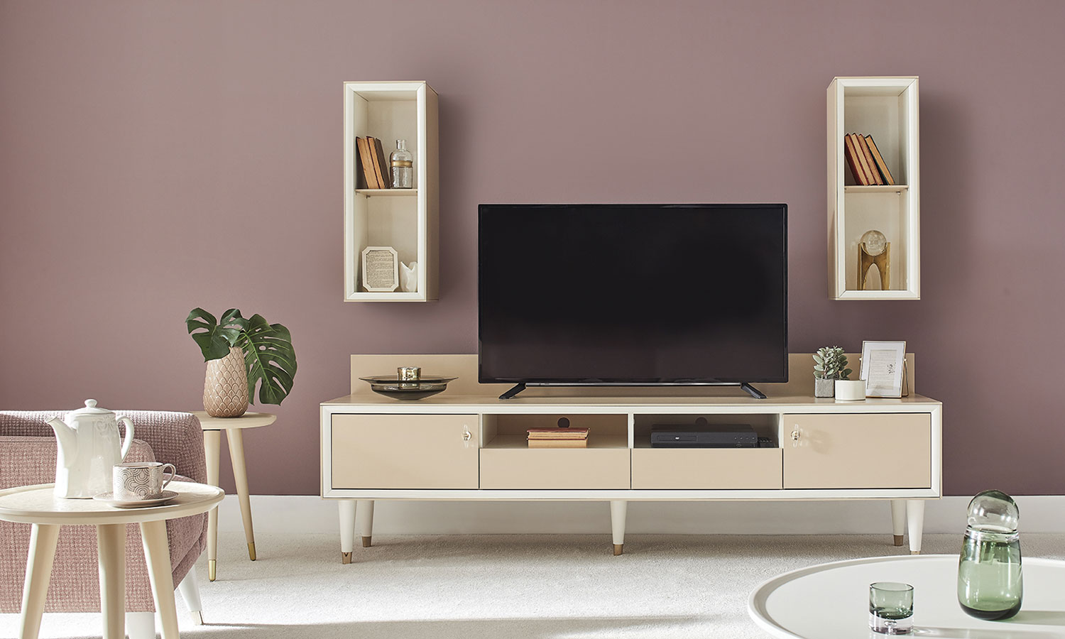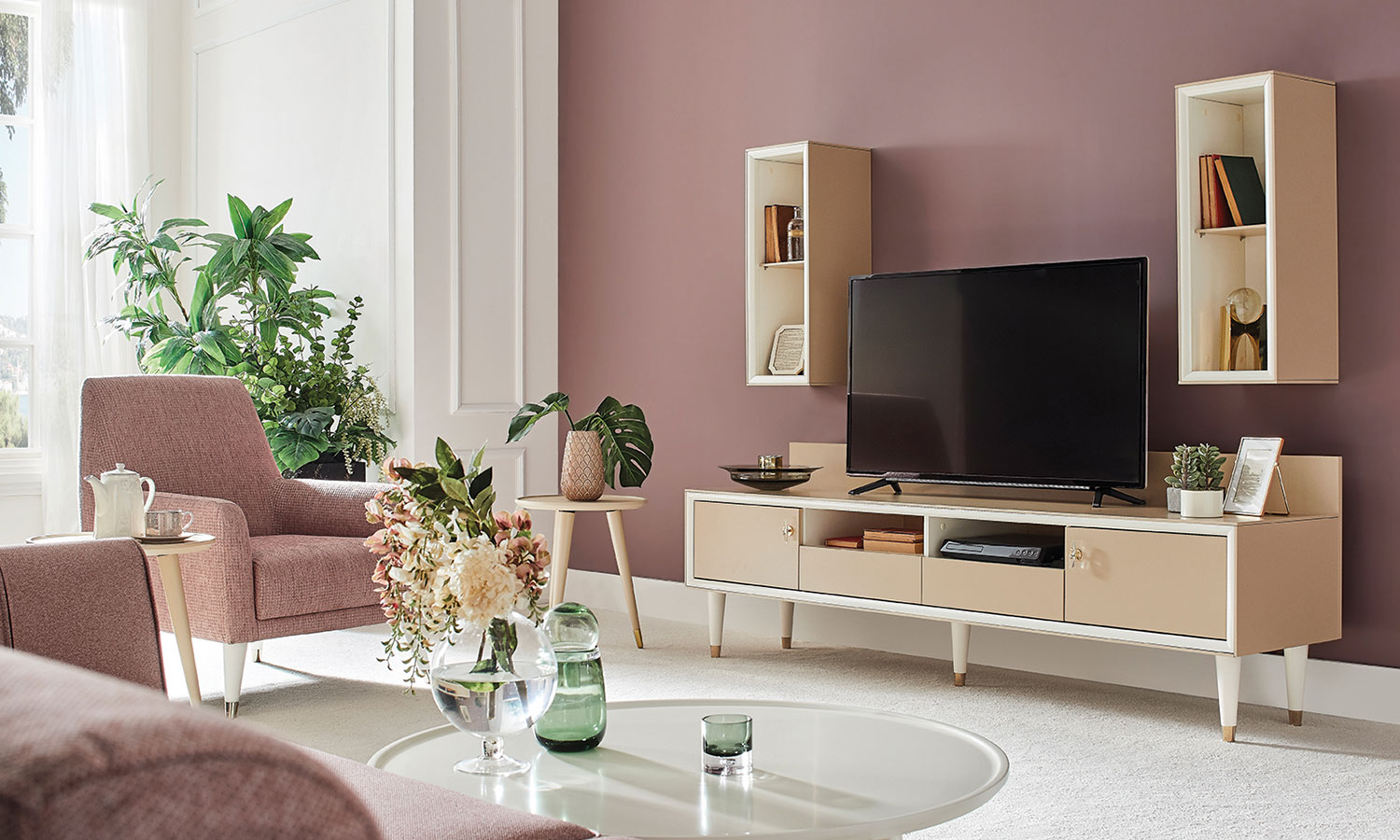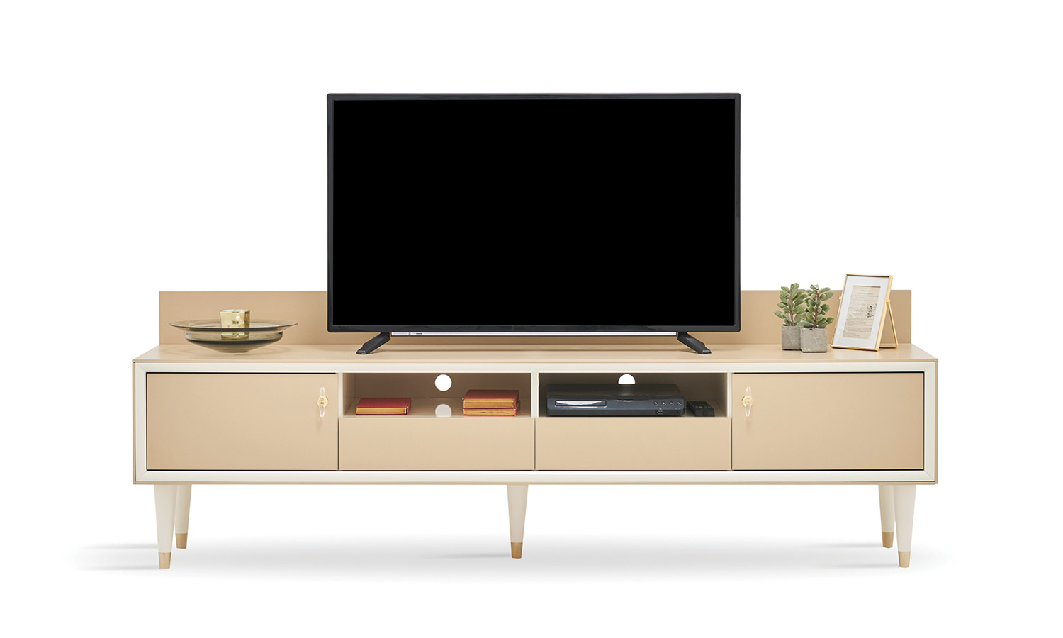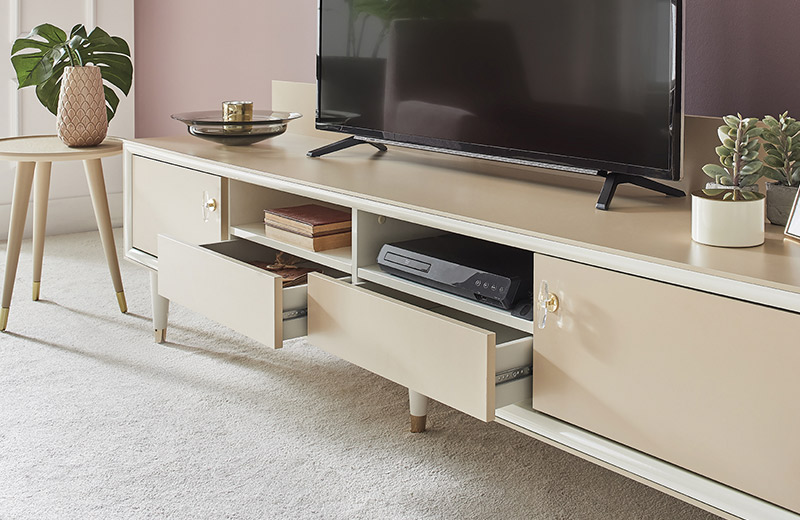 Romantic elegance meets convenient modules. Eva TV Unit fascinates with the elegance of caramel and pearl tones. The series, which stands out with its special design handles, is ideal for those who want to have a stylish and convenient lounge with 2 different size TV units with pearl profile application, elegant top cabinets with open racks.