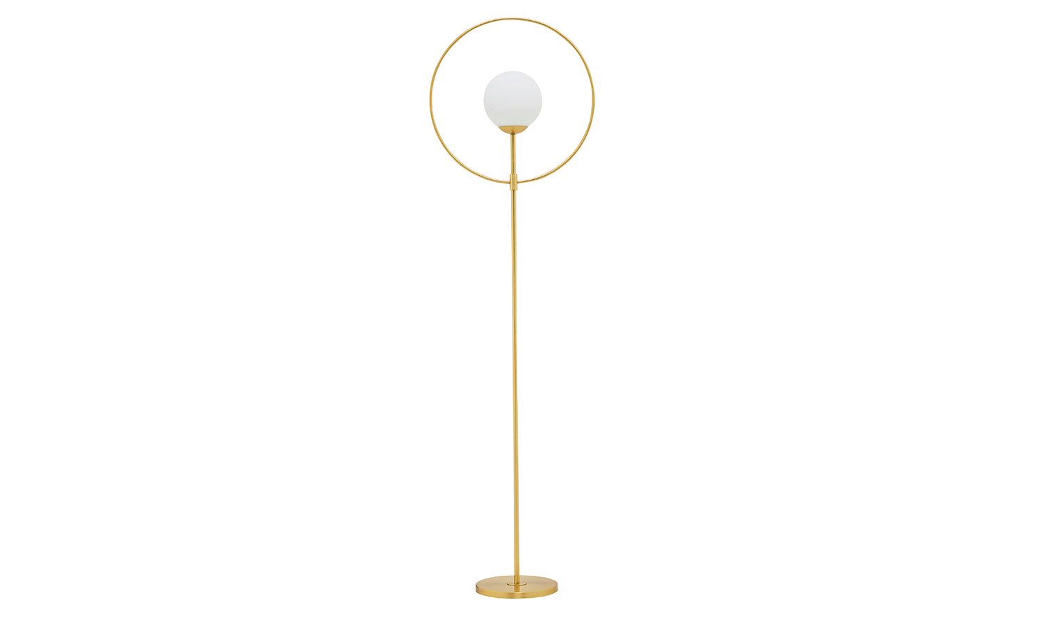 Lorena Floor Lamp, distinguished from today's lighting with its globe bulb complementing the circular matte gold head form characterizes the atmosphere of its location.