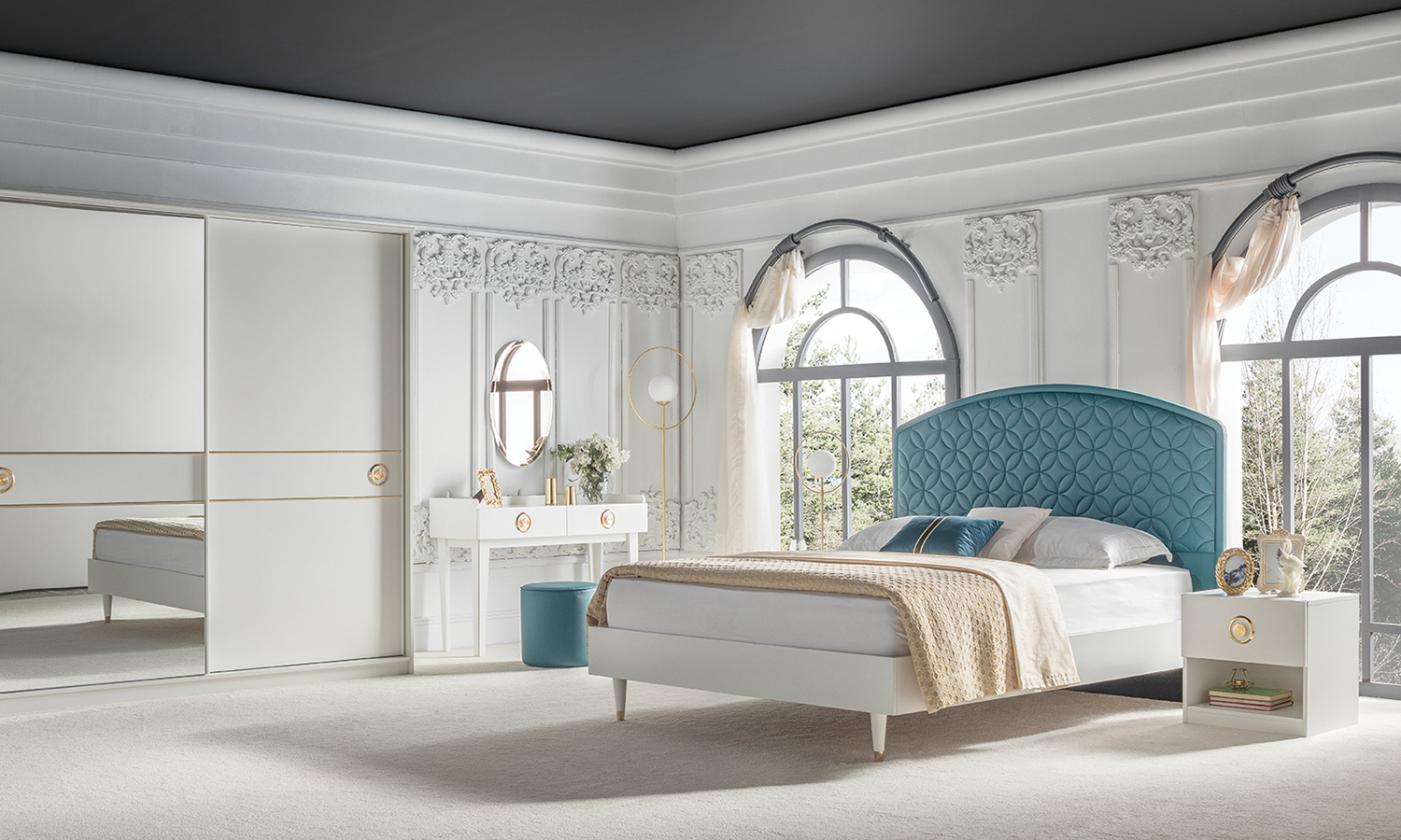 Emphasizing the contemporary design concept with its gold colour details and white surfaces, Romana Bedroom offers you the peace and tranquillity that you are looking for. Romana Bedroom enriches its contemporary and simple style with convenient and ergonomic modules. With a four- and five-door wardrobe options that are indispensable for stylish and tidy bedrooms, as well as a sliding-door wardrobe alternative with a stylish mirror that will make your room look much wider, it doesn't leave room for clutter in bedrooms. It creates a special corner for you with its vanity table module, which is an eyeful part of any traditional bedroom. Featured with its flawless design, handy modules and glittering gold colour details,Romana Bedroom is waiting for you to get your dream bedroom.