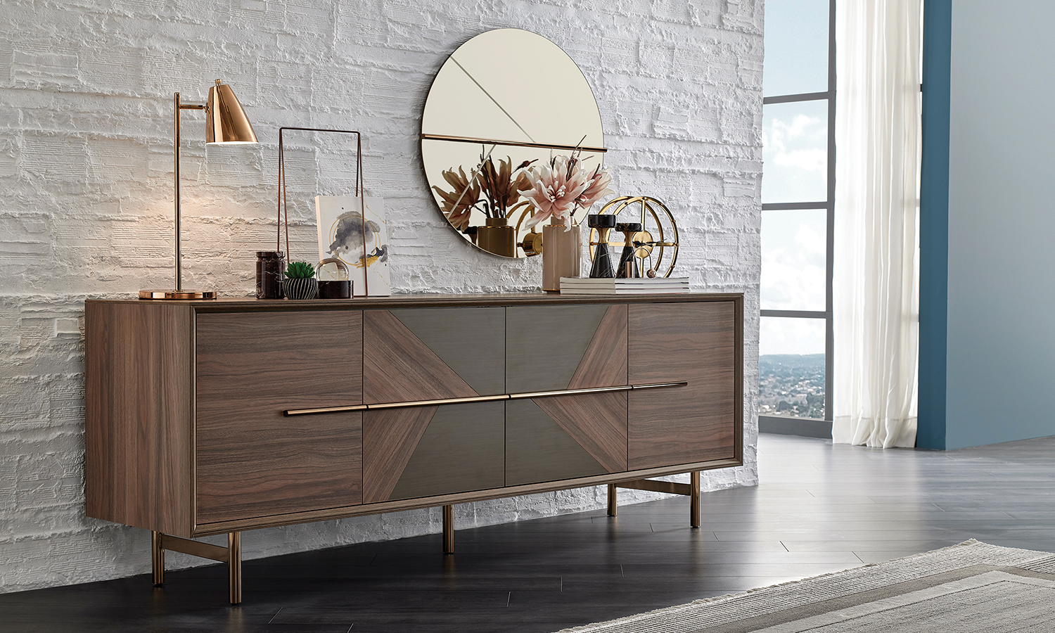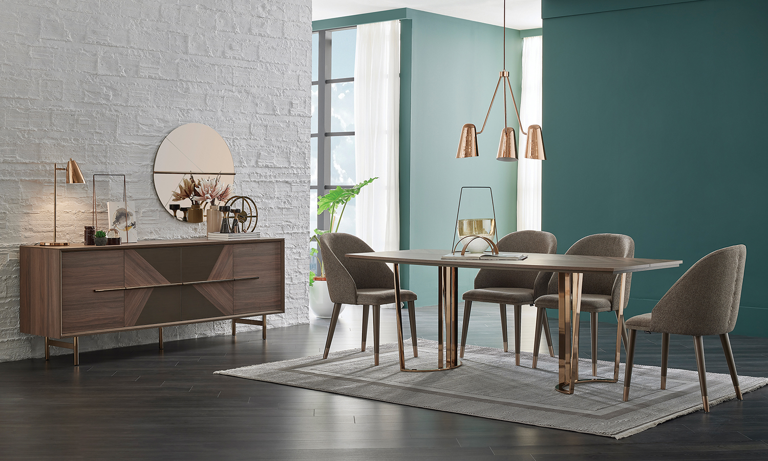 Impressing with its harmony of wood and metal textures, Lukka Dining Room adds a noble appearance to your living space. It offers the most suitable option for your home with fixed and extendible dining table alternatives with metal feet, and accompanies the pleasant moments you will spend with your guests in the most beautiful way. Having an elegant sparkle with its console with linen bronze lines and the mirror design, Lukka Dining Room will add a privileged stance to the rooms where it is located.
