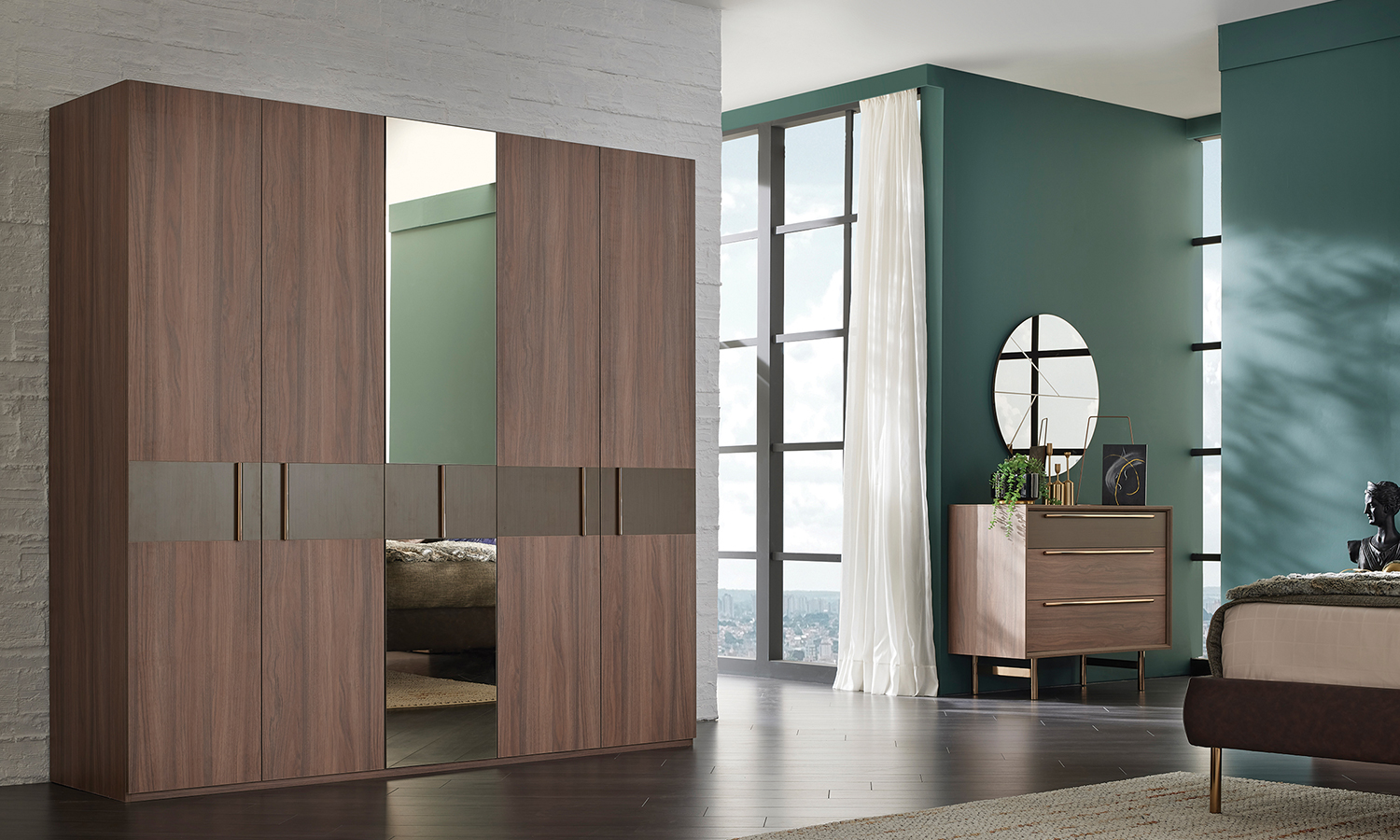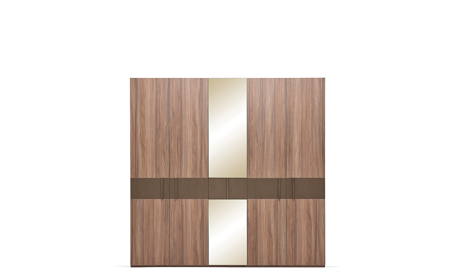 The secret of a stylish and linen look in your bedroom Lukka Bedroom attracts all the attention with its harmonious combination of bronze metal and wood texture. With 3 different wardrobe alternatives with functional drawers, it helps you to use your space efficiently and offers the most suitable storage space for your room. While maintaining the linen design of the series with its specially crafted headboard, the combination of walnut colour with brown provides an impressive decoration. Having a romantic look by featuring bronze metal details in dresser, nightstand and mirror designs, Lukka Bedroom promises an eye-catching environment in your bedroom."