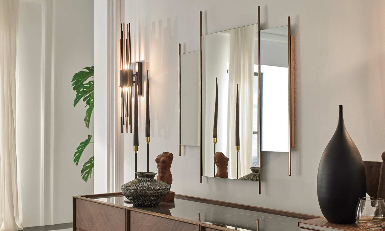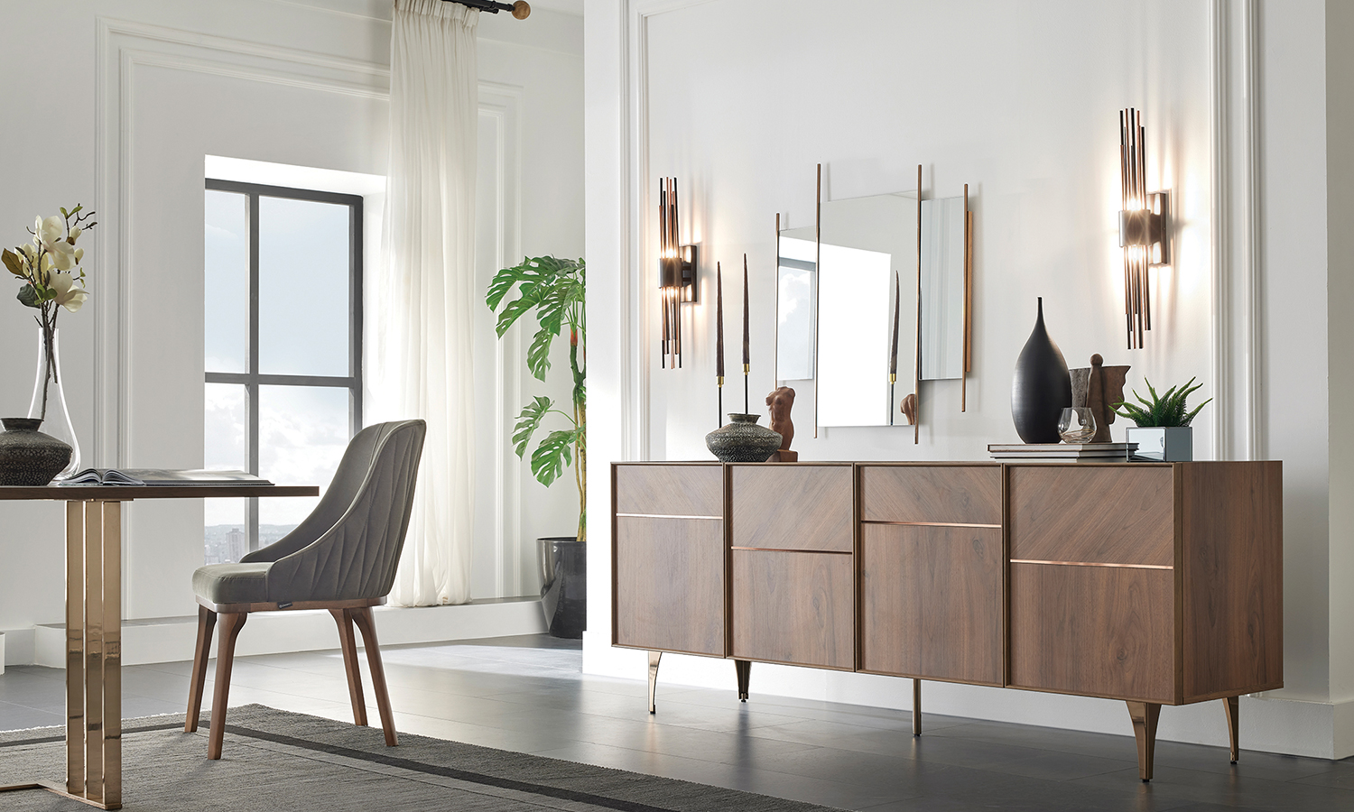 Bringing simple and warm textures into your living room, Ribera Series put a different interpretation to the colour of bronze and walnut. It completes the style of the series with its console promising a special appearance with its marble-looking top layer and its rectangular shaped metal detailed mirror. While providing a modern look with bronze strip details in cover applications, it also captures an aesthetic elegance with its wardrobe design without handles. It offers a functional use with two different dining table options metal feet as fixed and extendible, while completing its aesthetic appearance with two different chair alternatives to accompany your most special invitations. Ribera Dining Room will transform your hall into a privileged place with its marble texture combined with wood and eye-catching details.
