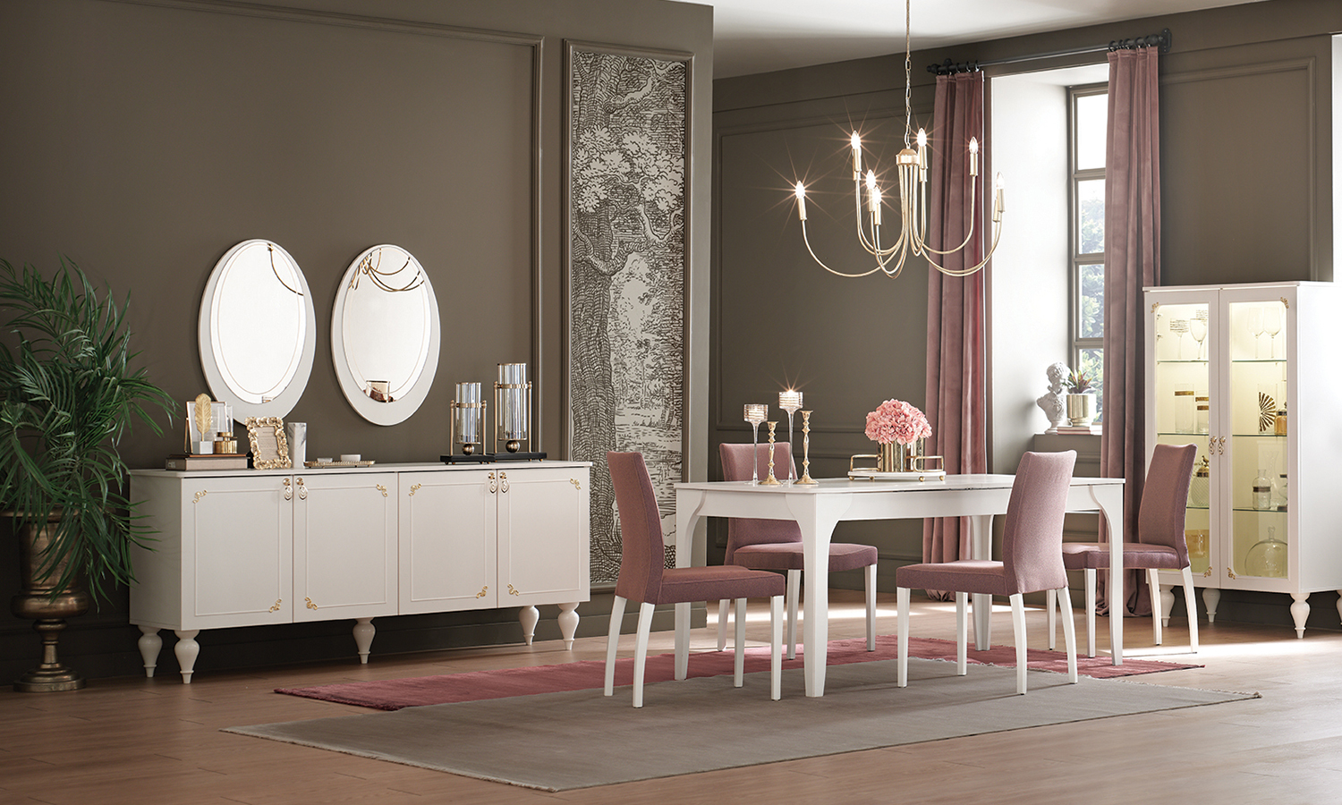 Rozy Dining Room, which complements the moonstone colour, which is a symbol of style and elegance, with special gold decorative details for the series, give your home a glamorous atmosphere. The unique sideboard design offers daylight spotlights designed specifically for the highboard module, extendable and fixed table options, and the storage and display areas that you need in the dining room with functional elegance. Enriched with gold pendulum handles as well as frame and ornamental details, the modules fit perfectly with their contemporary and stylish chairs. Rozy Dining Room will captivate everyone with its beauty in your delicious invitations for your guests.