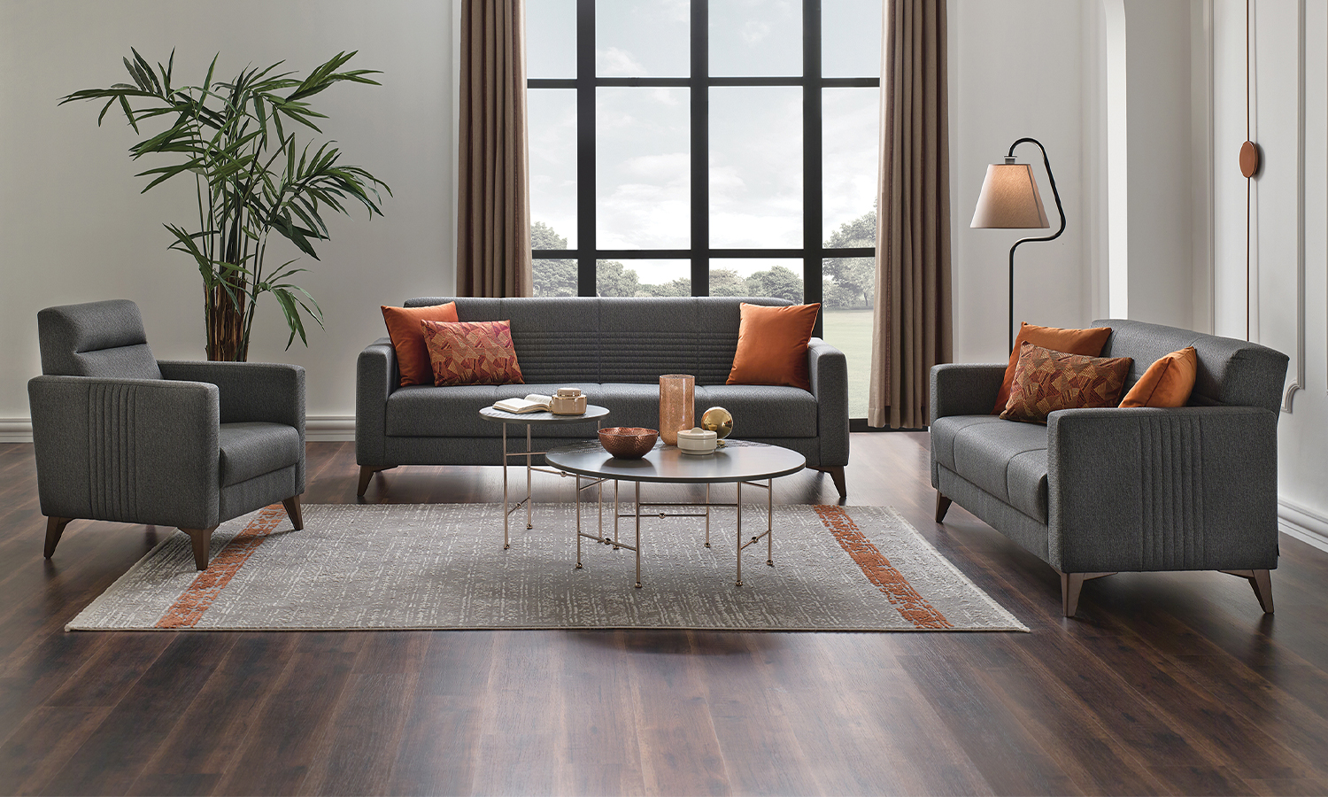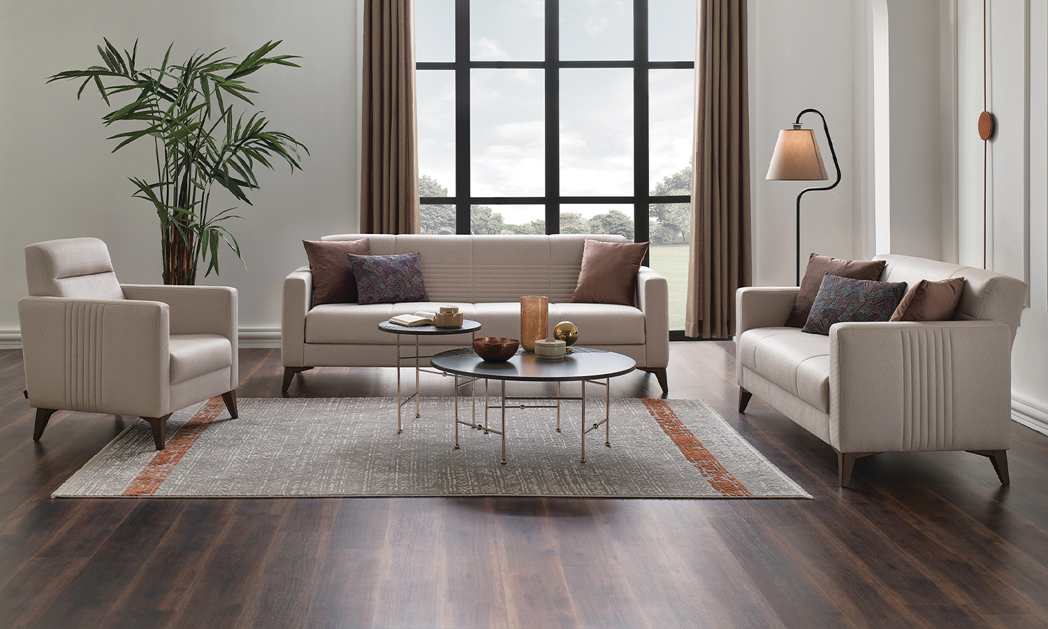 Nola Living Room will suit your home very well with its modern stance and unique color combinations. In addition to its elegance, the 3-seat sofa can easily be transformed into a bed, while the storage base feature offers you the additional storage space that you need in your living space. With velvet and linen fabric alternatives and walnut colored legs, the Nola Living Room will be the new face of comfort in homes.