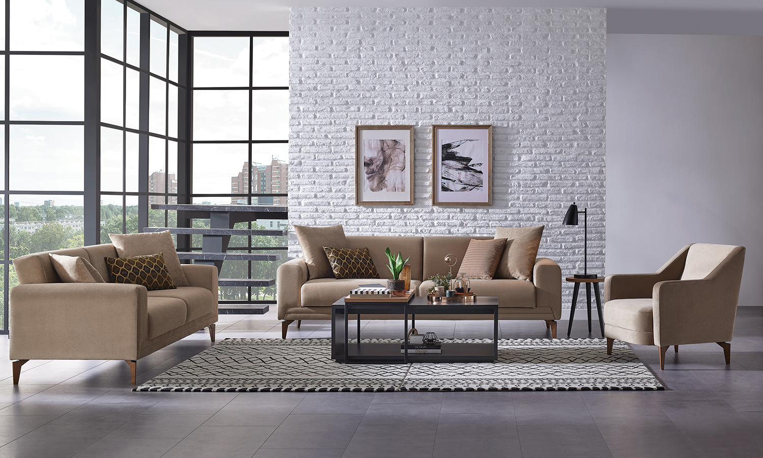 With its spacious and comfortable design, Lodi Living Room pioneers to loft style living spaces. While three seater sofa, which can be easily bed, offers spacious areas to your loved ones and you, accompanying armchair and single seater sofa alternatives carry the design you are looking for to your living room. Series’s colour alternatives, which complete its rustic breeze, and the natural looking texture create a warm living space. The leg alternatives in matt black and walnut facilitate cleaning thanks to their high structure from floor. Minimal and functional Lodi Living Room carries the comfort of being natural to your home.