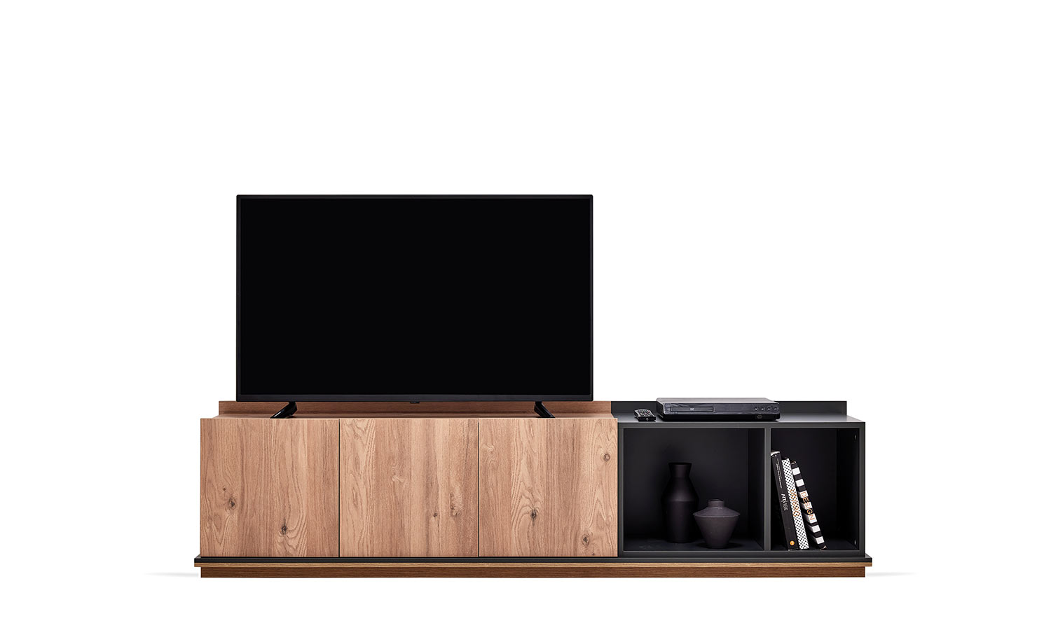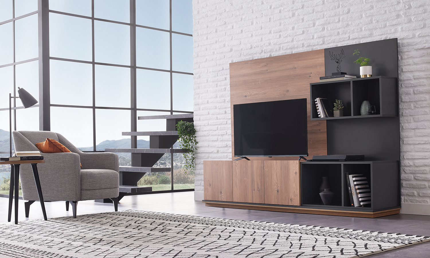 Completing its light oak colour with dark grey in a balanced way, Lodi TV Unit brings a natural look to your living room with its rustic design. Along with the elegance offered by its minimalist style, it provides a functional use by presenting extra storage through its upper modules with door. Providing refreshment in narrow spaces with its small size options, Lodi TV Unit, adapts to contemporary city life with its rustic style.