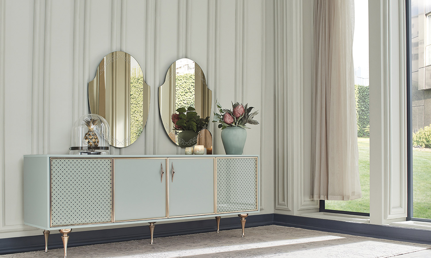An assertive elegance enriched by sparkling detail. Here's the secret to the impressive beauty of the Verta Dining Room. Its unique colour and mini pattern printed sideboard covers, remarkable rose frame profile details make the elegance of the Verta Dining Room unique. The rose-coloured metal effect leg design in the special form of the series gives this spectacular set a natural and warm elegance. Admired in all its glory, the Verta Dining Room will be the most important part of your perfect invitations.