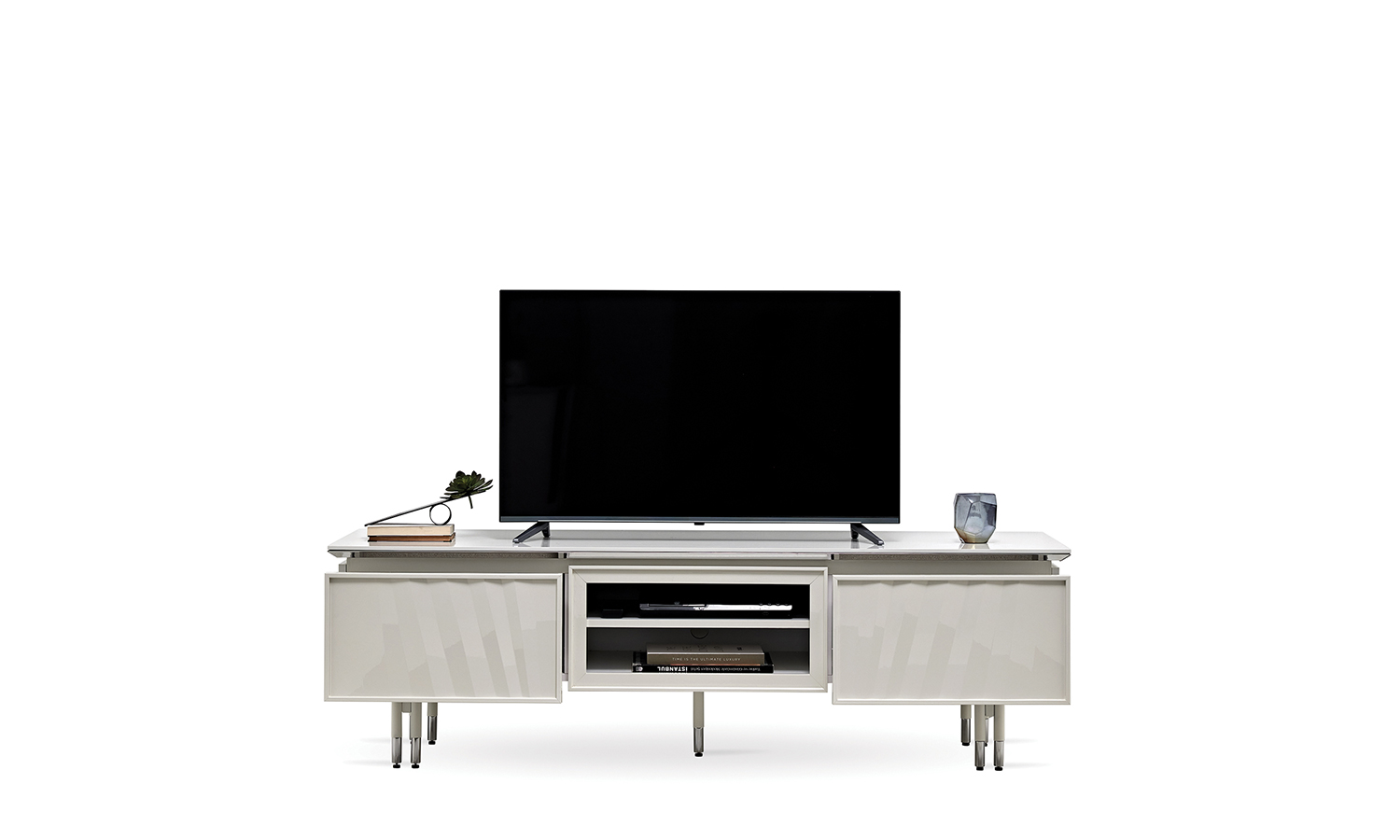 While the union of metal and marble design creates a stylish harmony, it offers the option of usage with different combinations thanks to its ample module variety. Complementing its plain and stylish look without handles with its special pattern application on the front panels of drawers in TV units, Albero Pearl TV Unit enlightens your living space with the day light spot lamp in its top module with open shelf.