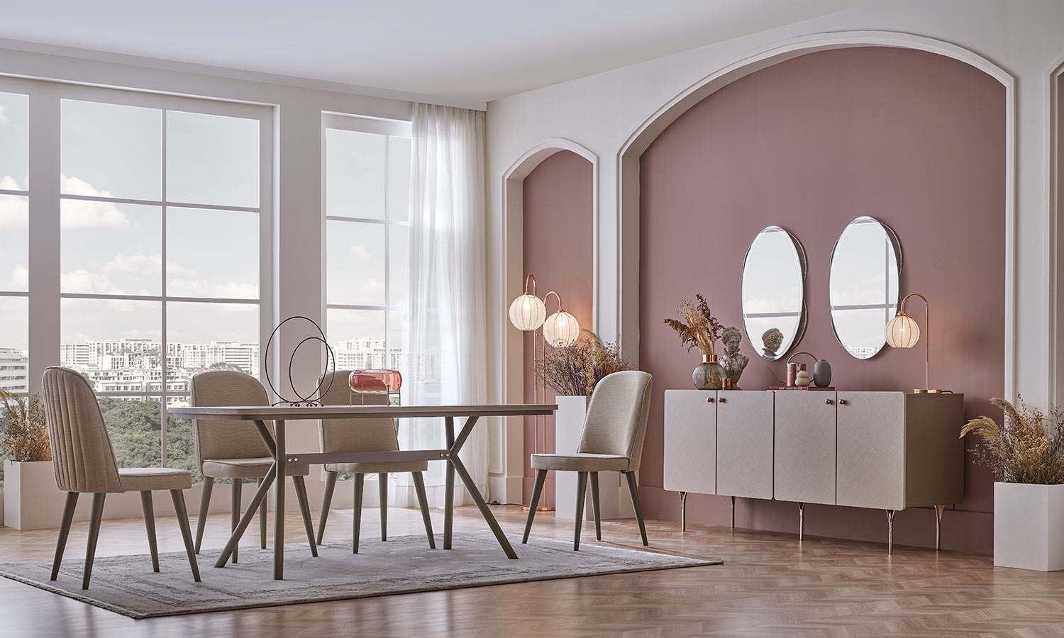 Silvia Dining Room reflects the harmony of covers with textured patterns and body of matte earth colour to your home. It adapts to any space with its extendable and fixed dining table alternatives and useful chairs. It completes the decoration of your home with its remarkable handle and leg details.