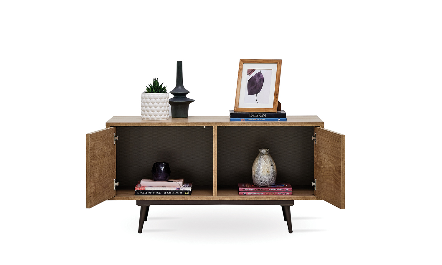 Offering solutions for every need with its modularity, Helis TV Unit provides large storage spaces. While changing the mode in your home with its light wood colour, it ensures practicality with its functionality. The wooden-look trims and the windowed effect of the trims on the glass shelves offer an aesthetic appearance.