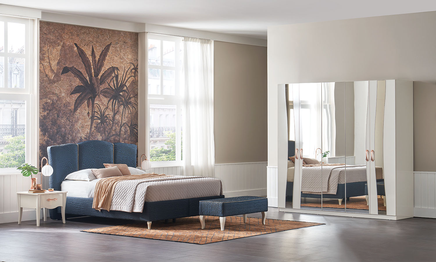With its serenity-giving contemporary-classical style, Silencio Bedroom offers you the layout and visuals of your dream with decorative and convenient module designs. 3 different wardrobe options with mirror detail in special curved form that separates the series from its counterparts, offer a attentive design concept. The series-specific flamboyant headboard is a piece which impresses with its glittering details. The drop-shaped dressing table mirror reveals the contemporary and expressive character of the series.