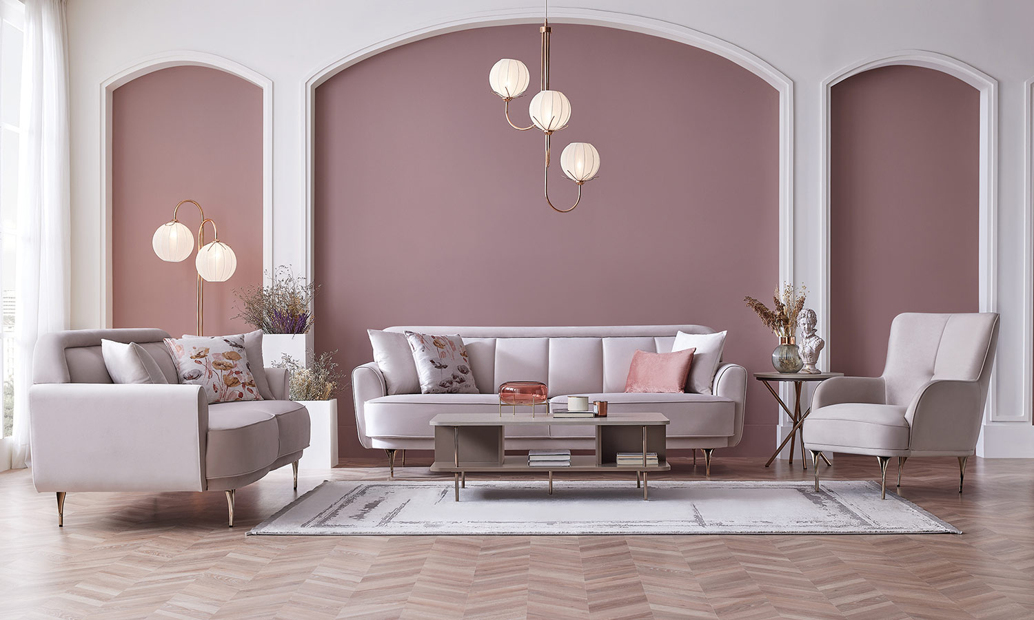 The Silvia Living Room creates a timeless beauty in your home with its modern design. The 3-seat sofa that can turn into a bed and the fixed 2.5-seat sofa options are complemented by the armchairs which have metal swivel leg and fixed walnut leg options. It offers decorative solutions with velvet and linen textured fabric options and provides a use advantage with its elegant coffee table and side table.