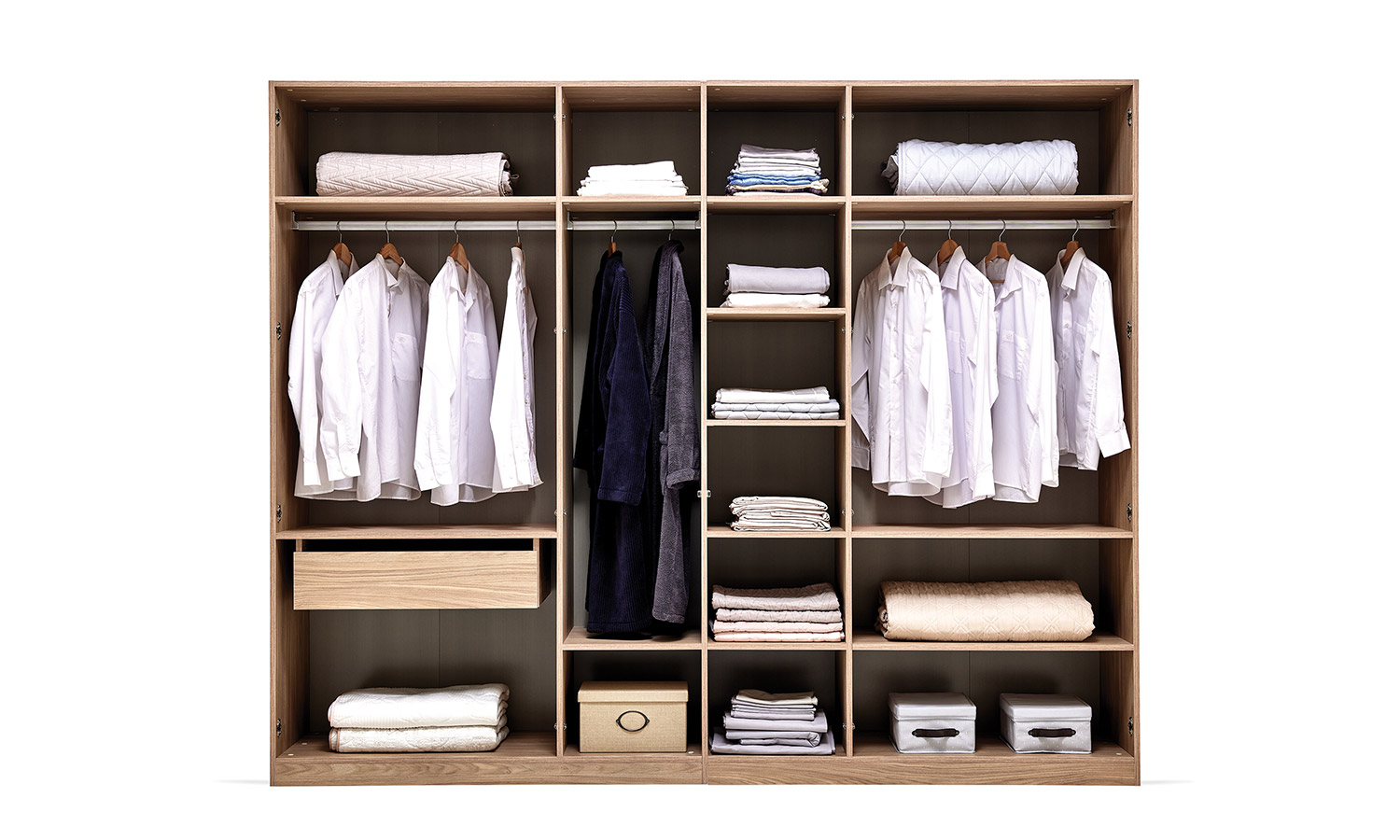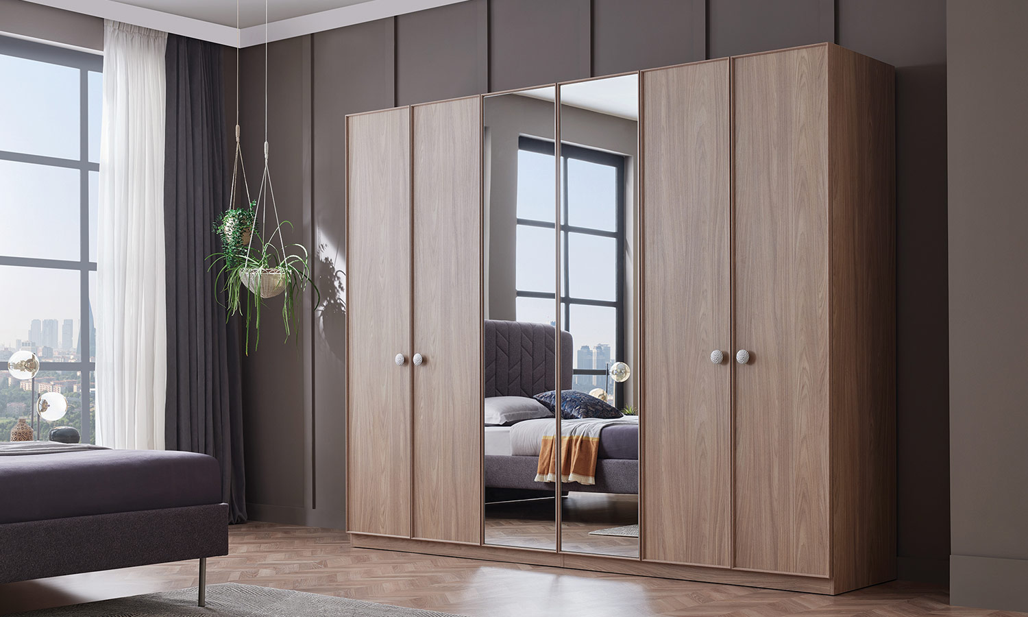 The Emma Bedroom reflects modernity with the quilting details in its headboard design. In addition to the wardrobe alternatives with 4, 5, and 6 doors, it also offers a wardrobe option with sliding doors which gives vertical and horizontal window-like effects. It brings an aesthetic order to your bedroom with its soft-looking headboard, high nightstand with metal legs, and feetside ottoman that provides extra storage area.