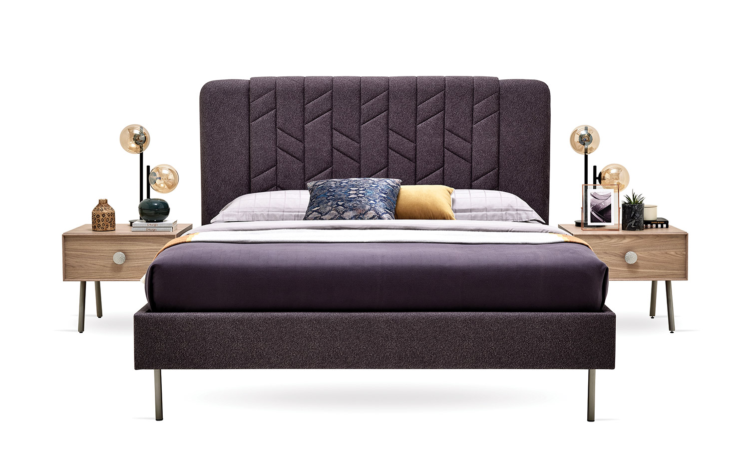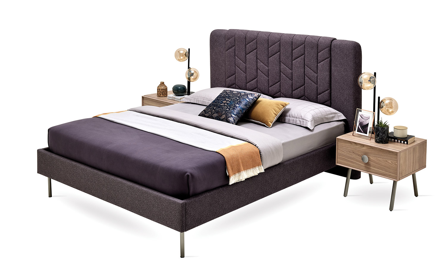 The Emma Bedroom reflects modernity with the quilting details in its headboard design. In addition to the wardrobe alternatives with 4, 5, and 6 doors, it also offers a wardrobe option with sliding doors which gives vertical and horizontal window-like effects. It brings an aesthetic order to your bedroom with its soft-looking headboard, high nightstand with metal legs, and feetside ottoman that provides extra storage area.