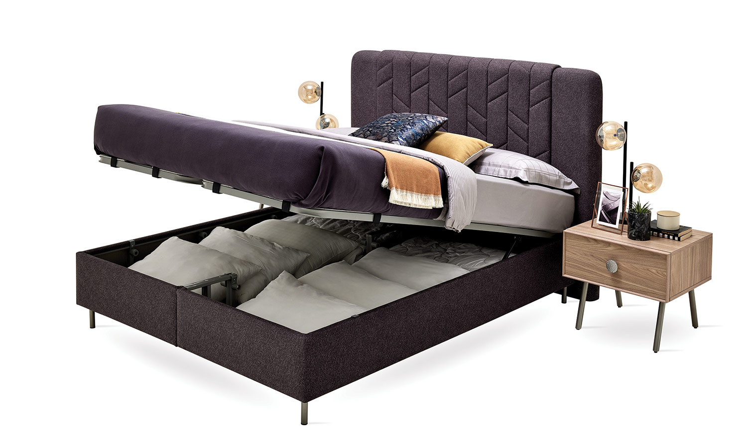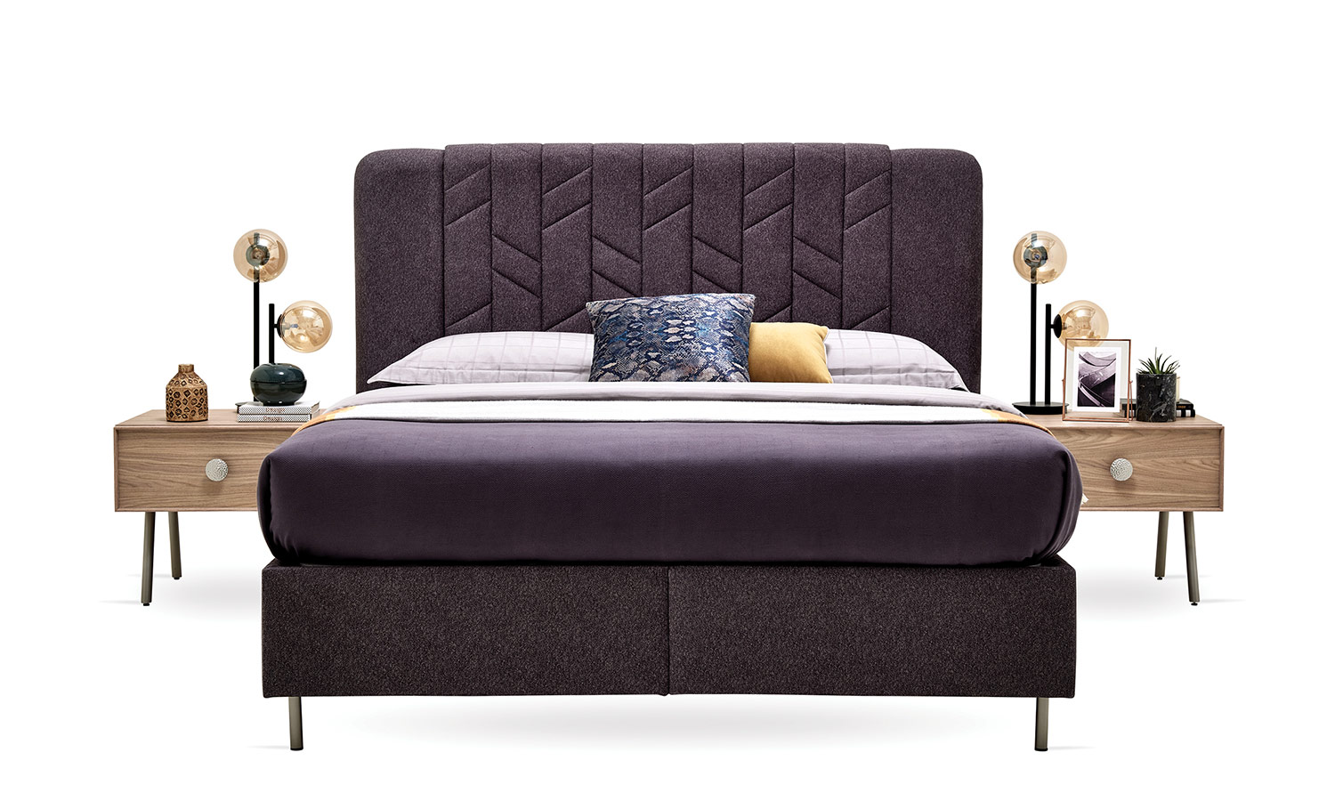 The Emma Bedroom reflects modernity with the quilting details in its headboard design. In addition to the wardrobe alternatives with 4, 5, and 6 doors, it also offers a wardrobe option with sliding doors which gives vertical and horizontal window-like effects. It brings an aesthetic order to your bedroom with its soft-looking headboard, high nightstand with metal legs, and feetside ottoman that provides extra storage area.