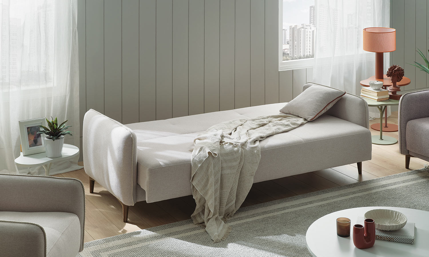 Pond Sofa, which adds a different atmosphere to your room with its modern style, stands out with its linen and velvet-looking fabric options. While providing extra storage space owing to its chest feature, it offers functional use with its easy-to-open and close bed mechanism. Pond Living Room, which draws attention with its meticulously crafted stitching details, provides easy cleaning with walnut-colored, high leg structure.