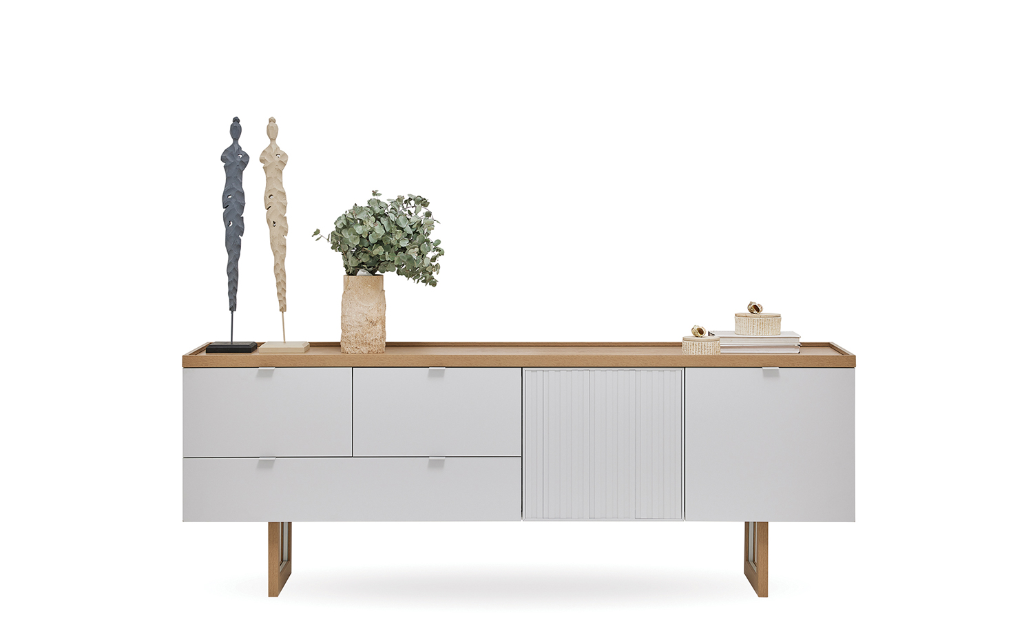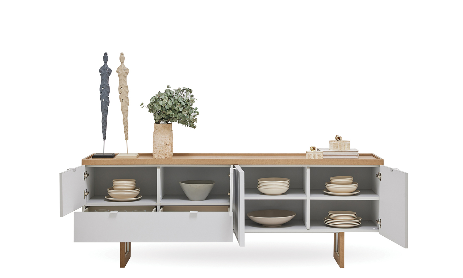 Puerta Dining Room adds a completely different atmosphere to your room with the harmony of the light-toned wood and white colors. The functional design, where the cabinet and drawers are used together, offers new storage areas. The top plate and slatted cover design that add depth to the console highlight aesthetics. The exclusive jute rope mirror design with lines reflecting the Mediterranean style represents elegance.
