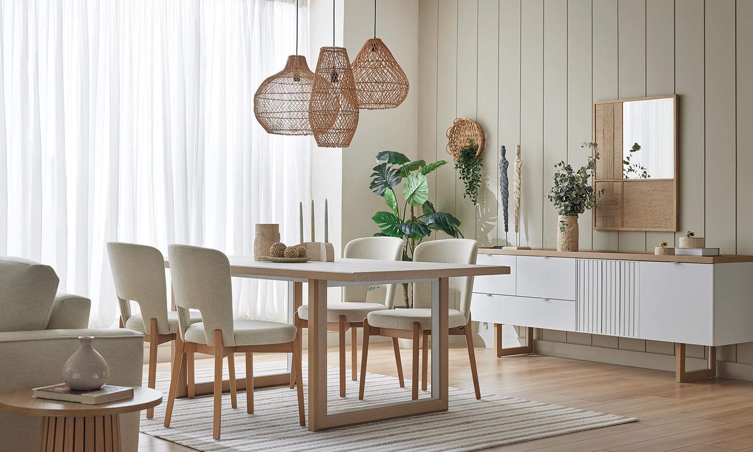 Puerta Dining Room adds a completely different atmosphere to your room with the harmony of the light-toned wood and white colors. The functional design, where the cabinet and drawers are used together, offers new storage areas. The top plate and slatted cover design that add depth to the console highlight aesthetics. The exclusive jute rope mirror design with lines reflecting the Mediterranean style represents elegance.