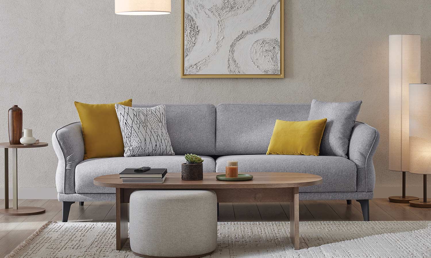Veneta Living Room combines comfort and functionality thanks to its high comfortable back cushion and t he feature of turning into a bed in two modules. Veneta Living Room stands out aesthetically with its angled armrest design and specially designed printed cushions.