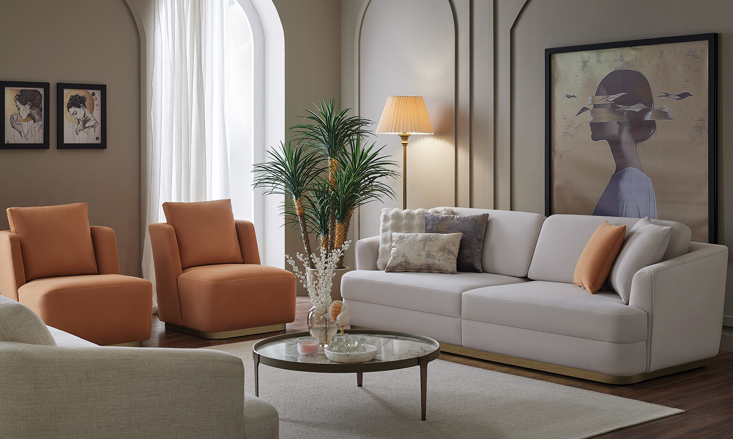 The Olimpia Living Room with Storage offers an eye-catching decoration, and it comes in a variety of fabric options, including linen and velvet. Warmth and refinement are infused into the design with storage base alternatives in walnut and bronze tones.